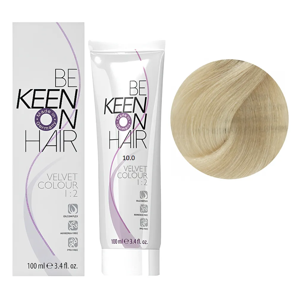 Перманентна крем-фарба VELVET COLOUR призначена для тонування та для делікатного фарбування. Забезпечує 90% зафарбовування сивини і має чудову стійкість. Стійкість до 40 разів миття. Особливості продукту: 10/0 ультра-світлий блондин Перманентна крем-фарба без аміаку, 100 мл VELVET COLOUR KEEN Активні компоненти: 10/0 ультра-світлий блондин Перманентна крем-фарба без аміаку, 100 мл VELVET COLOUR KEEN Застосування: 10/0 ультра-світлий блондин Перманентна крем-фарба без аміаку, 100 мл VELVET COLOUR KEEN Час витримки: 20-30 хвилин. Продукт призначений для професійного використання. Уважно ознайомтесь з інструкцією.Перманентна крем-фарба без аміаку VELVET COLOUR KEEN