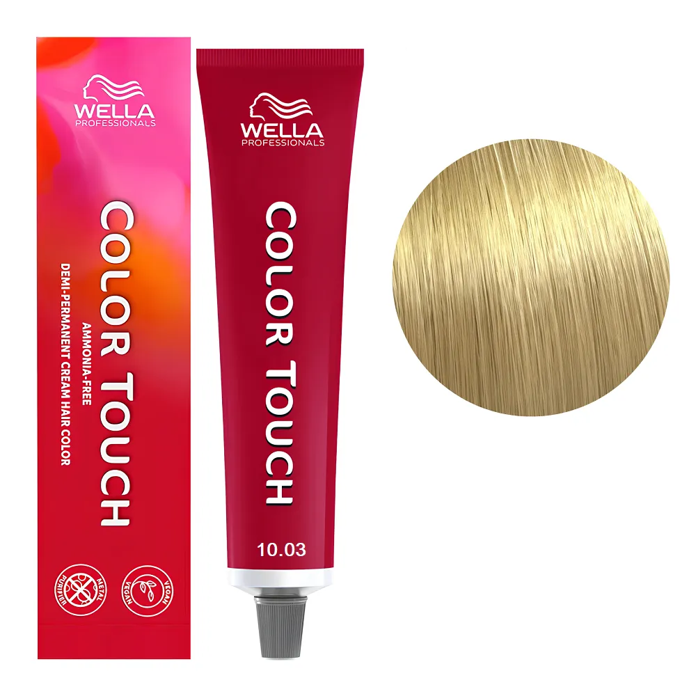 Фарба без аміаку Color Touch - це новий рівень фарбування: багатовимірне тонування волосся. Веганський склад із вмістом до 85% інгредієнтів натурального походження, без аміаку (за винятком Color Touch Plus, що призначена для сивого волосся), робить фарбування максимально делікатним. Особливості продукту: 10/03 найсвітліший натурально-золотистий Фарба для тонування волосся без аміаку (Оновлена формула), 60 мл COLOR TOUCH Wella Professionals Усі відтінки базової гами Color Touch можна змішувати між собою. Застосування: 10/03 найсвітліший натурально-золотистий Фарба для тонування волосся без аміаку (Оновлена формула), 60 мл COLOR TOUCH Wella Professionals Час витримки: з теплом 15 хвилин, без тепла 20-25 хвилин. Продукт призначений для професійного використання. Уважно ознайомтесь з інструкцією.Тонувальна фарба без аміаку Color Touch Wella Professionals з оновленою веганською формулою