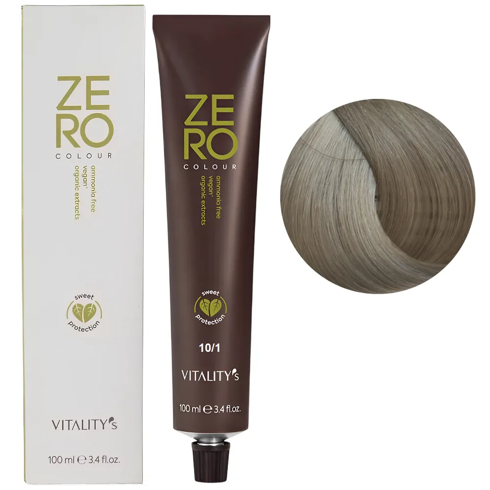 Zero Colour – це веганська фарба з високим натуральним індексом, зі зниженим ризиком подразнення та алергії. Завдяки антиоксидантним та пом`якшувальним властивостям, вона допомагає захистити колір та робить волосся м`яким і шовковистим. Формула без аміаку делікатно відновлює волосся для багатогранного, насиченого та сяючого кольору. Здатна задовольнити бажання кольору всіх жінок, навіть тих, хто має проблеми з чутливістю шкіри. Результат зберігається до 6 тижнів. Зменшуються подразнення та сухість шкіри голови, покращується загальний стан волосся після фарбування. Особливості продукту: 10/1 платиновий блондин попелястий Крем-фарба для волосся без аміаку, 100 мл ZERO VEGAN Vitality`s Застосування: 10/1 платиновий блондин попелястий Крем-фарба для волосся без аміаку, 100 мл ZERO VEGAN Vitality`s Важливо! Продукт для професійного застосування. Уважно ознайомтесь з інструкцією..Крем-фарба для волосся без аміаку ZERO VEGAN Vitality`s