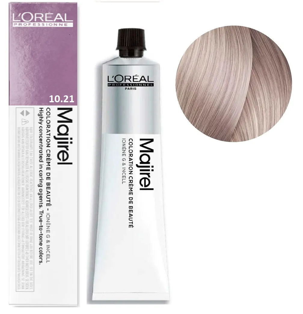 Majirel від L’Oreal Professionnel - це професійна стійка крем-фарба, створена для майстрів, які цінують точність, передбачуваність і розкішний результат фарбування. Формула розроблена з урахуванням останніх досягнень у сфері колористики, щоб забезпечити насичений колір, ідеальне покриття сивини та неперевершений блиск. Завдяки технології Ionene G™ та Incell™ волосся зберігає здорову структуру навіть після інтенсивного фарбування. Активні компоненти проникають у глибину волокна, зміцнюють кутикулу та підвищують стійкість кольору. Результат - шовковисті пасма з глибоким, багатовимірним відтінком. Особливості продукту: 10/21 Екстра-світлий блондин фіолетово-попелястий Фарба для волосся стійка, 60 мл Majirel L`Oreal Professionnel (оновлений формат) Застосування: 10/21 Екстра-світлий блондин фіолетово-попелястий Фарба для волосся стійка, 60 мл Majirel L`Oreal Professionnel (оновлений формат) Пропорції змішування з окислювачем: Час витримки залежить від обраної фарби та бажаного результату фарбування. Фарба Majirel від L’Oreal Professionnel призначена для професійного використання! Уважно ознайомтесь з інструкцією.Фарба для волосся стійка Majirel L`Oreal Professionnel (оновлений формат - 60 мл)
