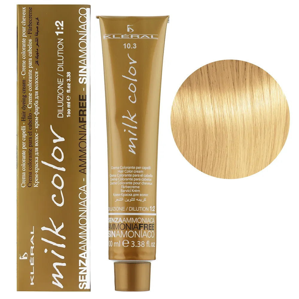 Безаміачна фарба Milk Color, розроблена італійською компанією Kleral System, представлена більше ніж 40 відтінками. Прекрасно забарвлює волосся, у тому числі і сиве (якщо сивини не більше 50%) у близькі до натуральних кольорів. Завдяки своєму щадному складу і компонентам, що доглядають, не пошкоджує структуру волосся, надає їм блиск і м`якість. Milk Color ідеально підходить для пошкодженого волосся. Тюбик містить 100 мл фарби та розрахований на 2 повні нанесення. Рекомендований окислювач - 20-vol стабілізований перекис водню. Для збільшення освітлювальної дії, використовуйте стабілізований перекис водню в 30- або 40-vol емульсії. Особливості продукту: 10/3 Екстра світлий медовий блондин Крем-фарба для волосся перманентна без аміаку, 100 мл Milk Color KLERAL System Застосування: 10/3 Екстра світлий медовий блондин Крем-фарба для волосся перманентна без аміаку, 100 мл Milk Color KLERAL System Продукт призначений для професійного використання. Уважно ознайомтесь з інструкцією.Крем-фарба для волосся перманентна без аміаку Milk Color KLERAL System