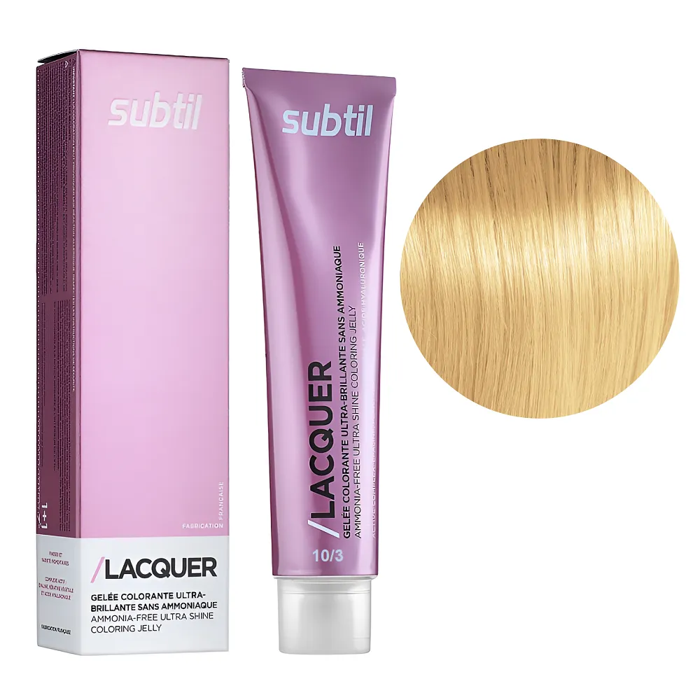Subtil Lacquer - це фарба для волосся, створена без використання аміаку, на основі гілауроновой кислоти, рослинного кератину і EPOLINE - запатентованої формули (кукурудзяна олія + кисень). З цією фарбою тепер ви можете забути про процедуру відновлення кератину - фарбування і насичення волосся кератином відбувається одночасно і всього за 20 хвилин. Формула Lacquer містить також компоненти, що захищають шкіру, це робить фарбу доступною для застосування при дуже чутливій шкірі голови. Особливості продукту: 10/3 екстрасвітлий блондин золотистий Безаміачна тонувальна гелева фарба на кислотній основі, 60 мл LACQUER SUBTIL Застосування: 10/3 екстрасвітлий блондин золотистий Безаміачна тонувальна гелева фарба на кислотній основі, 60 мл LACQUER SUBTIL Час витримки: 10/3 екстрасвітлий блондин золотистий Безаміачна тонувальна гелева фарба на кислотній основі, 60 мл LACQUER SUBTIL Витримати на волоссі 20 хвилин після нанесення на коріння. Застосовувати фарбу слід, суворо дотримуючись інструкції, яка додається до кожної упаковки.Безаміачна тонувальна гелева фарба на кислотній основі LACQUER SUBTIL