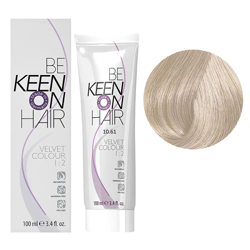 Перманентна крем-фарба VELVET COLOUR призначена для тонування та для делікатного фарбування. Забезпечує 90% зафарбовування сивини і має чудову стійкість. Стійкість до 40 разів миття. Особливості продукту: 10/61 ультра-світлий фіолетово-попелястий блондин Перманентна крем-фарба без аміаку, 100 мл VELVET COLOUR KEEN Активні компоненти: 10/61 ультра-світлий фіолетово-попелястий блондин Перманентна крем-фарба без аміаку, 100 мл VELVET COLOUR KEEN Застосування: 10/61 ультра-світлий фіолетово-попелястий блондин Перманентна крем-фарба без аміаку, 100 мл VELVET COLOUR KEEN Час витримки: 20-30 хвилин. Продукт призначений для професійного використання. Уважно ознайомтесь з інструкцією.Перманентна крем-фарба без аміаку VELVET COLOUR KEEN