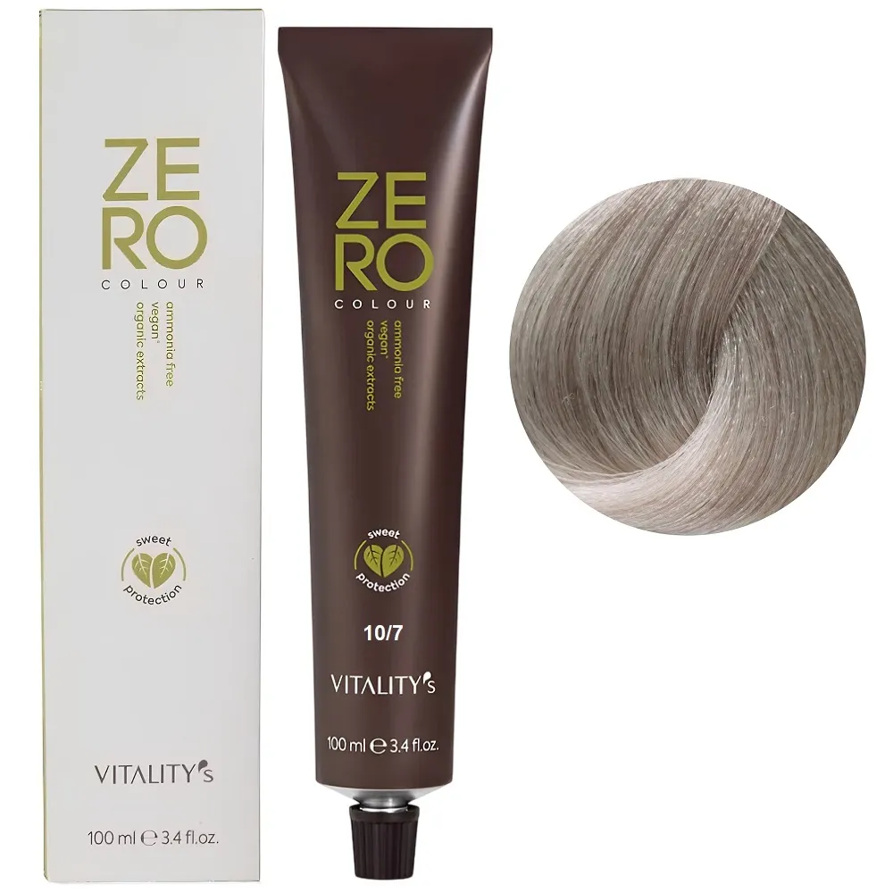 Zero Colour – це веганська фарба з високим натуральним індексом, зі зниженим ризиком подразнення та алергії. Завдяки антиоксидантним та пом`якшувальним властивостям, вона допомагає захистити колір та робить волосся м`яким і шовковистим. Формула без аміаку делікатно відновлює волосся для багатогранного, насиченого та сяючого кольору. Здатна задовольнити бажання кольору всіх жінок, навіть тих, хто має проблеми з чутливістю шкіри. Результат зберігається до 6 тижнів. Зменшуються подразнення та сухість шкіри голови, покращується загальний стан волосся після фарбування. Особливості продукту: 10/7 платиновий блондин перлинний Крем-фарба для волосся без аміаку, 100 мл ZERO VEGAN Vitality`s Застосування: 10/7 платиновий блондин перлинний Крем-фарба для волосся без аміаку, 100 мл ZERO VEGAN Vitality`s Важливо! Продукт для професійного застосування. Уважно ознайомтесь з інструкцією..Крем-фарба для волосся без аміаку ZERO VEGAN Vitality`s