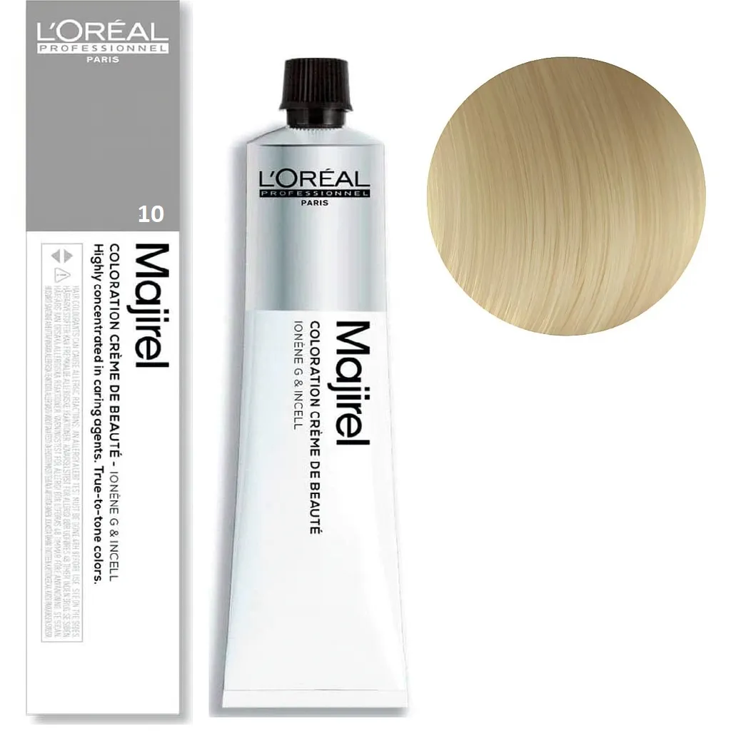 Majirel від L’Oreal Professionnel - це професійна стійка крем-фарба, створена для майстрів, які цінують точність, передбачуваність і розкішний результат фарбування. Формула розроблена з урахуванням останніх досягнень у сфері колористики, щоб забезпечити насичений колір, ідеальне покриття сивини та неперевершений блиск. Завдяки технології Ionene G™ та Incell™ волосся зберігає здорову структуру навіть після інтенсивного фарбування. Активні компоненти проникають у глибину волокна, зміцнюють кутикулу та підвищують стійкість кольору. Результат - шовковисті пасма з глибоким, багатовимірним відтінком. Особливості продукту: 10 Екстра-світлий блондин натуральний Фарба для волосся стійка, 60 мл Majirel L`Oreal Professionnel (оновлений формат)т Застосування: 10 Екстра-світлий блондин натуральний Фарба для волосся стійка, 60 мл Majirel L`Oreal Professionnel (оновлений формат) Пропорції змішування з окислювачем: Час витримки залежить від обраної фарби та бажаного результату фарбування. Фарба Majirel від L’Oreal Professionnel призначена для професійного використання! Уважно ознайомтесь з інструкцією.Фарба для волосся стійка Majirel L`Oreal Professionnel (оновлений формат - 60 мл)