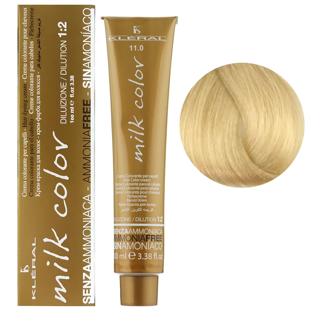 Безаміачна фарба Milk Color, розроблена італійською компанією Kleral System, представлена більше ніж 40 відтінками. Прекрасно забарвлює волосся, у тому числі і сиве (якщо сивини не більше 50%) у близькі до натуральних кольорів. Завдяки своєму щадному складу і компонентам, що доглядають, не пошкоджує структуру волосся, надає їм блиск і м`якість. Milk Color ідеально підходить для пошкодженого волосся. Тюбик містить 100 мл фарби та розрахований на 2 повні нанесення. Рекомендований окислювач - 20-vol стабілізований перекис водню. Для збільшення освітлювальної дії, використовуйте стабілізований перекис водню в 30- або 40-vol емульсії. Особливості продукту: 11/0 Екстра світлий платиновий блондин Крем-фарба для волосся перманентна без аміаку, 100 мл Milk Color KLERAL System Застосування: 11/0 Екстра світлий платиновий блондин Крем-фарба для волосся перманентна без аміаку, 100 мл Milk Color KLERAL System Продукт призначений для професійного використання. Уважно ознайомтесь з інструкцією.Крем-фарба для волосся перманентна без аміаку Milk Color KLERAL System