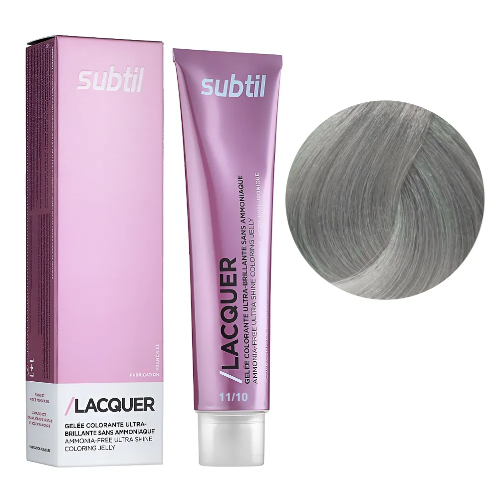 Subtil Lacquer - це фарба для волосся, створена без використання аміаку, на основі гілауроновой кислоти, рослинного кератину і EPOLINE - запатентованої формули (кукурудзяна олія + кисень). З цією фарбою тепер ви можете забути про процедуру відновлення кератину - фарбування і насичення волосся кератином відбувається одночасно і всього за 20 хвилин. Формула Lacquer містить також компоненти, що захищають шкіру, це робить фарбу доступною для застосування при дуже чутливій шкірі голови. Особливості продукту: 11/10 ультрасвітлий блондин сріблястий Безаміачна тонувальна гелева фарба на кислотній основі, 60 мл LACQUER SUBTIL Застосування: 11/10 ультрасвітлий блондин сріблястий Безаміачна тонувальна гелева фарба на кислотній основі, 60 мл LACQUER SUBTIL Час витримки: 11/10 ультрасвітлий блондин сріблястий Безаміачна тонувальна гелева фарба на кислотній основі, 60 мл LACQUER SUBTIL Витримати на волоссі 20 хвилин після нанесення на коріння. Застосовувати фарбу слід, суворо дотримуючись інструкції, яка додається до кожної упаковки.Безаміачна тонувальна гелева фарба на кислотній основі LACQUER SUBTIL