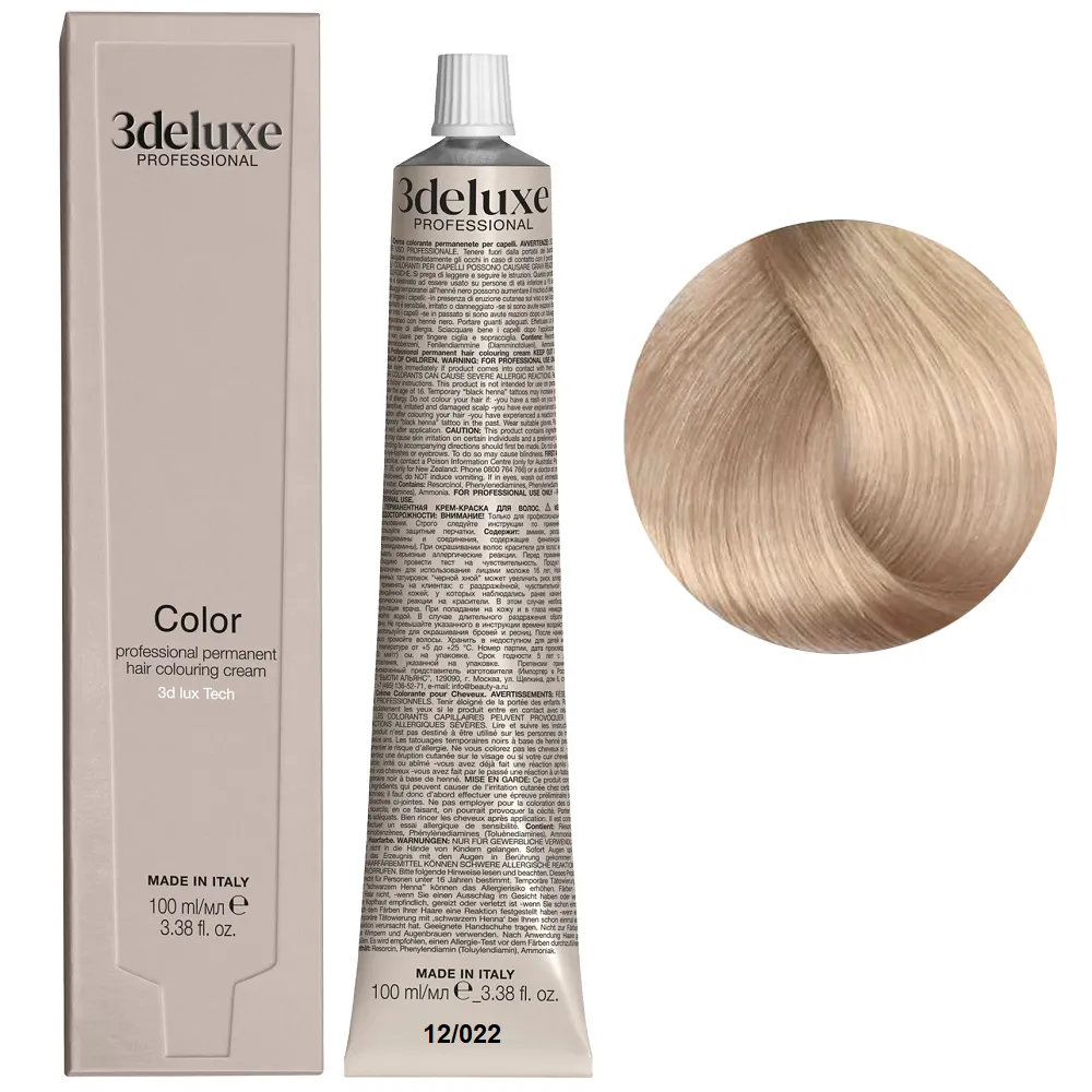 Професійна стійка кремова фарба для волосся Permanent Hair Color 3deluxe з неймовірним відбиттям світла та чудовим захистом, забезпечує волоссю неперевершену якість. Містить технологію 3D Lux, яка забезпечує насичений, яскравий, багатогранний колір: Особливості продукту: 12/022 спеціальний блондин перлинний сандре Фарба для волосся, 100 мл Permanent Hair Color 3Deluxe Professional Активні компоненти: 12/022 спеціальний блондин перлинний сандре Фарба для волосся, 100 мл Permanent Hair Color 3Deluxe Professional Застосування: 12/022 спеціальний блондин перлинний сандре Фарба для волосся, 100 мл Permanent Hair Color 3Deluxe Professional Змішайте в пластмасовому посуді крему-фарбу Color 3deluxe з кремом-окислювачем 1,5%, 3%, 6%, 9% або 12%. Пропорції змішування: для основної палітри відтінків - 1:1,5, для освітлювального ряду - 1:2, для більш насиченого кольору - 1:1. Час витримки залежить від бажаного результату. Важливо! Продукт для професійного застосування. Уважно ознайомтесь з інструкцією.Фарба для волосся Permanent Hair Color 3deluxe Professional