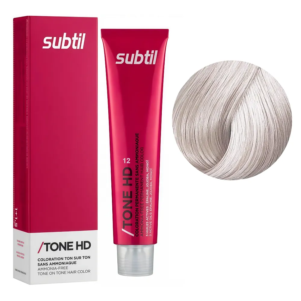 Тонувальна крем-фарба TONE HD має легку консистенцію, що відрізняється м`яким, делікатним впливом на волосся і шкіру голови. Tone HD дозволяє зробити рефреш кольору та підсилення власного тону волосся. Фарба підходить для підтримки необхідного кольору відразу після фарбування, після проведення хімічної завивки, для створення тимчасового відтінку або для фарбування тон-в-тон. В результаті фарбування волосся набуває досконалого вигляду, інтенсивниого яскравого кольору та ідеального блиску. Особливості продукту: 12 сірий сріблястий металик Gris Argent Безаміачна крем-фарба для тонування волосся на лужній основі, 60 мл TONE HD SUBTIL Застосування: 12 сірий сріблястий металик Gris Argent Безаміачна крем-фарба для тонування волосся на лужній основі, 60 мл TONE HD SUBTIL Розвести в неметалевій ємності: 1 частина Subtil Tone HD + 1,5 частини Subtil OXI 2.7%. Наносимо на сухе, немите волосся. Змиваються безаммиачні фарби поступово, легко, рівномірно, через 4-6 тижнів при митті 2 рази в тиждень, завдяки цьому волосся, що відростає не відрізняється від вже забарвленого. Застосовувати фарбу слід, суворо дотримуючись інструкції, яка додається до кожної упаковки.Безаміачна крем-фарба для тонування волосся на лужній основі TONE HD SUBTIL