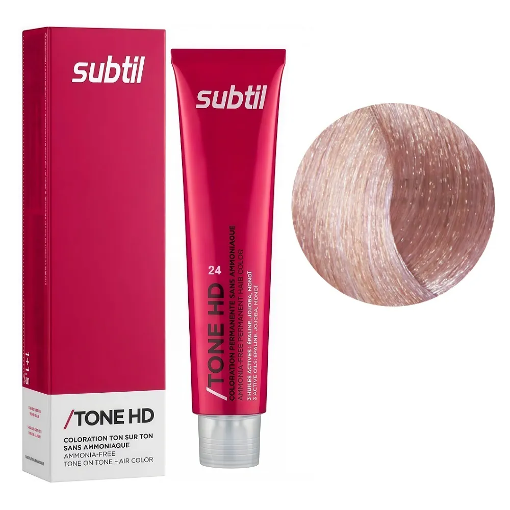 Тонувальна крем-фарба TONE HD має легку консистенцію, що відрізняється м`яким, делікатним впливом на волосся і шкіру голови. Tone HD дозволяє зробити рефреш кольору та підсилення власного тону волосся. Фарба підходить для підтримки необхідного кольору відразу після фарбування, після проведення хімічної завивки, для створення тимчасового відтінку або для фарбування тон-в-тон. В результаті фарбування волосся набуває досконалого вигляду, інтенсивниого яскравого кольору та ідеального блиску. Особливості продукту: 24 рожеве золото металик Or Rose Безаміачна крем-фарба для тонування волосся на лужній основі, 60 мл TONE HD SUBTIL Застосування: 24 рожеве золото металик Or Rose Безаміачна крем-фарба для тонування волосся на лужній основі, 60 мл TONE HD SUBTIL/span> Розвести в неметалевій ємності: 1 частина Subtil Tone HD + 1,5 частини Subtil OXI 2.7%. Наносимо на сухе, немите волосся. Змиваються безаммиачні фарби поступово, легко, рівномірно, через 4-6 тижнів при митті 2 рази в тиждень, завдяки цьому волосся, що відростає не відрізняється від вже забарвленого. Застосовувати фарбу слід, суворо дотримуючись інструкції, яка додається до кожної упаковки.Безаміачна крем-фарба для тонування волосся на лужній основі TONE HD SUBTIL