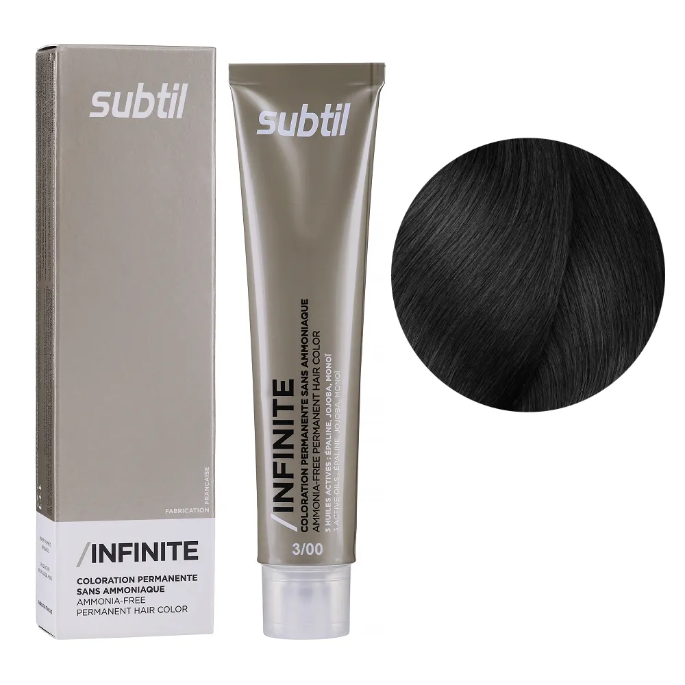 Subtil Infinite - фарба без вмісту аміаку нового покоління, що містить щонайменше 78% інгредієнтів природного походження та трилогію дорогоцінних олій: жожоба, моної, кукурудзяної. Забезпечує 100% зафарбовування сивини, супер блиск та супер стійкість. Безаміачна фарба додає волоссю стійкий і насичений колір, при цьому не ушкоджує і не висушує його. Олії, що входять до складу зволожують і ущільнюють волосся, роблять його блискучим і шовковистим. Щадна формула підходить навіть власницям чутливої шкіри голови. Так само фарба здатна освітлити волосся до трьох рівнів, що є революцією в світі безаміачних фарб. Розкішний колір, гладкість і здоровий блиск без шкоди для волосся. Застосування: 3/00 інтенсивний темний шатен Безаміачна стійка крем-фарба для волосся, 60 мл Permanent Hair Color INFINITE SUBTIL Крем-фарбу потрібно наносити на брудне сухе волосся. Фарбу слід змивати ретельно до повної прозорості води. Час витримки: 3/00 інтенсивний темний шатен Безаміачна стійка крем-фарба для волосся, 60 мл Permanent Hair Color INFINITE SUBTIL Витримати на волоссі від 30 до 35 хвилин, при наявності сивого волосся час впливу можна збільшити на 10 хвилин. Застосовувати фарбу слід, суворо дотримуючись інструкції, яка додається до кожної упаковки.Безаміачна крем-фарба для волосся Permanent Hair Color INFINITE SUBTIL