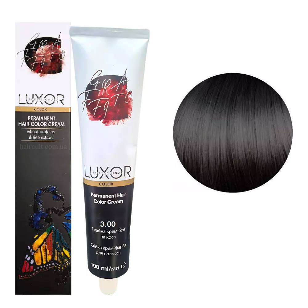 Особливості продукту: 3/00 Темний коричневий натуральний інтенсивний Стійка крем-фарба для волосся, 100мл Permanent Hair Color Cream LUXOR Professional Складається з TriplexSystem COLOR - інноваційної системи, що включає в себе три агента фарбування волосся для найкращого результату: Застосування: 3/00 Темний коричневий натуральний інтенсивний Стійка крем-фарба для волосся, 100мл Permanent Hair Color Cream LUXOR Professional У ємності змішайте фарбник, поживний флюїд і оксидант, нанесіть на волосся і залиште на необхідний час, змийте теплою водою. Перед використанням уважно ознайомтесь з інструкцією!Крем-фарба для волосся перманентна Permanent Hair Color Cream LUXOR Professional