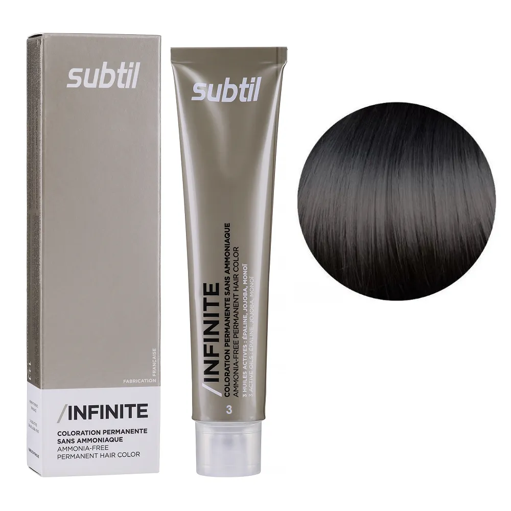Subtil Infinite - фарба без вмісту аміаку нового покоління, що містить щонайменше 78% інгредієнтів природного походження та трилогію дорогоцінних олій: жожоба, моної, кукурудзяної. Забезпечує 100% зафарбовування сивини, супер блиск та супер стійкість. Безаміачна фарба додає волоссю стійкий і насичений колір, при цьому не ушкоджує і не висушує його. Олії, що входять до складу зволожують і ущільнюють волосся, роблять його блискучим і шовковистим. Щадна формула підходить навіть власницям чутливої шкіри голови. Так само фарба здатна освітлити волосся до трьох рівнів, що є революцією в світі безаміачних фарб. Розкішний колір, гладкість і здоровий блиск без шкоди для волосся. Застосування: 3 темний шатен Безаміачна стійка крем-фарба для волосся, 60 мл Permanent Hair Color INFINITE SUBTIL Крем-фарбу потрібно наносити на брудне сухе волосся. Фарбу слід змивати ретельно до повної прозорості води. Час витримки: 3 темний шатен Безаміачна стійка крем-фарба для волосся, 60 мл Permanent Hair Color INFINITE SUBTIL Витримати на волоссі від 30 до 35 хвилин, при наявності сивого волосся час впливу можна збільшити на 10 хвилин. Застосовувати фарбу слід, суворо дотримуючись інструкції, яка додається до кожної упаковки.Безаміачна крем-фарба для волосся Permanent Hair Color INFINITE SUBTIL