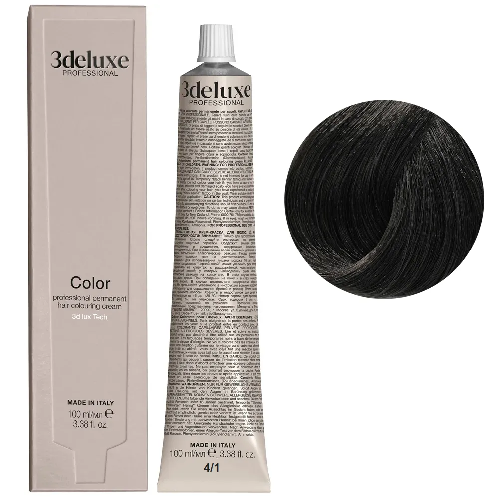 Професійна стійка кремова фарба для волосся Permanent Hair Color 3deluxe з неймовірним відбиттям світла та чудовим захистом, забезпечує волоссю неперевершену якість. Містить технологію 3D Lux, яка забезпечує насичений, яскравий, багатогранний колір: Особливості продукту: 4/1 коричневий попелястий Фарба для волосся, 100 мл Permanent Hair Color 3deluxe Professional Активні компоненти: 4/1 коричневий попелястий Фарба для волосся, 100 мл Permanent Hair Color 3deluxe Professional Застосування: 4/1 коричневий попелястий Фарба для волосся, 100 мл Permanent Hair Color 3deluxe Professional Змішайте в пластмасовому посуді крему-фарбу Color 3deluxe з кремом-окислювачем 1,5%, 3%, 6%, 9% або 12%. Пропорції змішування: для основної палітри відтінків - 1:1,5, для освітлювального ряду - 1:2, для більш насиченого кольору - 1:1. Час витримки залежить від бажаного результату. Важливо! Продукт для професійного застосування. Уважно ознайомтесь з інструкцією.Фарба для волосся Permanent Hair Color 3deluxe Professional