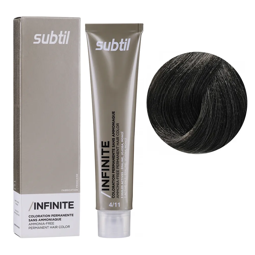 Subtil Infinite - фарба без вмісту аміаку нового покоління, що містить щонайменше 78% інгредієнтів природного походження та трилогію дорогоцінних олій: жожоба, моної, кукурудзяної. Забезпечує 100% зафарбовування сивини, супер блиск та супер стійкість. Безаміачна фарба додає волоссю стійкий і насичений колір, при цьому не ушкоджує і не висушує його. Олії, що входять до складу зволожують і ущільнюють волосся, роблять його блискучим і шовковистим. Щадна формула підходить навіть власницям чутливої шкіри голови. Так само фарба здатна освітлити волосся до трьох рівнів, що є революцією в світі безаміачних фарб. Розкішний колір, гладкість і здоровий блиск без шкоди для волосся. Застосування: 4/11 шатен інтенсивний попелястий Безаміачна стійка крем-фарба для волосся, 60 мл Permanent Hair Color INFINITE SUBTILL Крем-фарбу потрібно наносити на брудне сухе волосся. Фарбу слід змивати ретельно до повної прозорості води. Час витримки: 4/11 шатен інтенсивний попелястий Безаміачна стійка крем-фарба для волосся, 60 мл Permanent Hair Color INFINITE SUBTIL Витримати на волоссі від 30 до 35 хвилин, при наявності сивого волосся час впливу можна збільшити на 10 хвилин. Застосовувати фарбу слід, суворо дотримуючись інструкції, яка додається до кожної упаковки.Безаміачна стійка крем-фарба для волосся Permanent Hair Color INFINITE SUBTIL