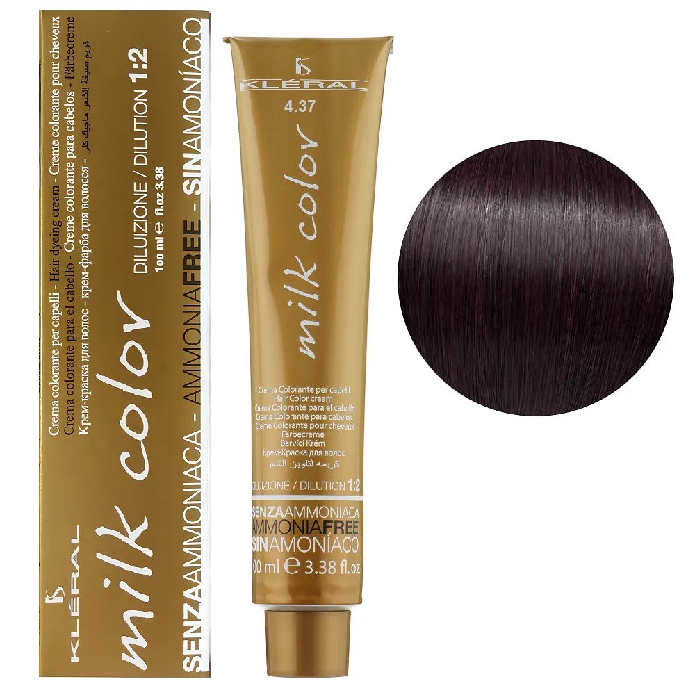Безаміачна фарба Milk Color, розроблена італійською компанією Kleral System, представлена більше ніж 40 відтінками. Прекрасно забарвлює волосся, у тому числі і сиве (якщо сивини не більше 50%) у близькі до натуральних кольорів. Завдяки своєму щадному складу і компонентам, що доглядають, не пошкоджує структуру волосся, надає їм блиск і м`якість. Milk Color ідеально підходить для пошкодженого волосся. Тюбик містить 100 мл фарби та розрахований на 2 повні нанесення. Рекомендований окислювач - 20-vol стабілізований перекис водню. Для збільшення освітлювальної дії, використовуйте стабілізований перекис водню в 30- або 40-vol емульсії. Особливості продукту: 4/37 Ірисовий шатен Крем-фарба для волосся перманентна без аміаку, 100 мл Milk Color KLERAL System Застосування: 4/37 Ірисовий шатен Крем-фарба для волосся перманентна без аміаку, 100 мл Milk Color KLERAL System Продукт призначений для професійного використання. Уважно ознайомтесь з інструкцією.Крем-фарба для волосся перманентна без аміаку Milk Color KLERAL System