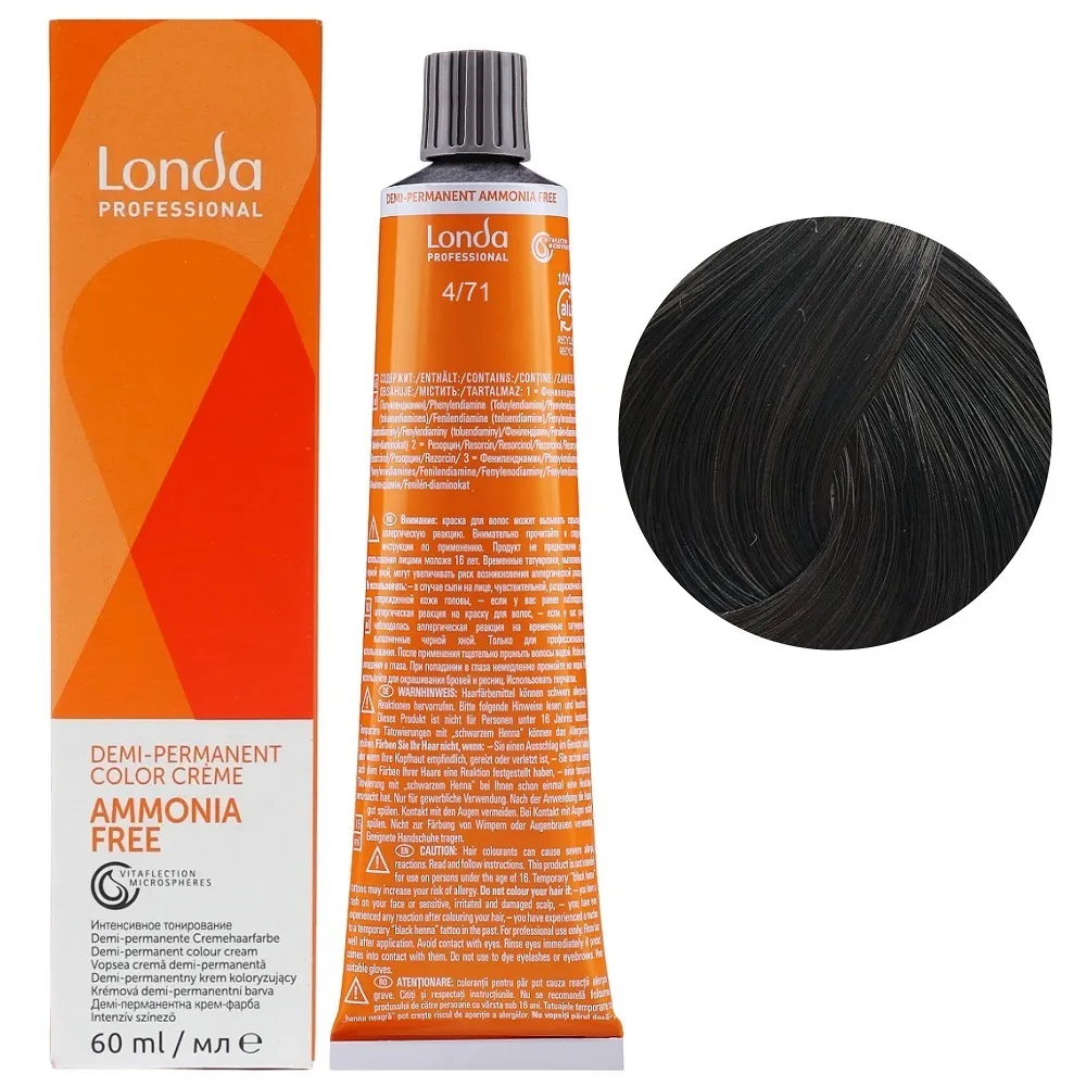 Фарба для інтенсивного тонування без аміаку зі світловідбивними мікросферами Vitaflection створює живе, сяюче волосся з багатовимірним блиском. Demi-Permanent використовує середовище для підлужнення без аміаку та пероксиди низької концентрації, тому прекурсори барвників проникають у волокна волосся менш глибоко. Завдяки цьому структура волосся змінюється менше, ніж при використанні стійких крем-фарб Permanent Color. Особливості продукту: 4/71 середній брюнет коричнево-попелястий Демі-перманентна фарба без аміаку, 60 мл Demi-Permanent Color Londa Professional Застосування: 4/71 середній брюнет коричнево-попелястий Демі-перманентна фарба без аміаку, 60 мл Demi-Permanent Color Londa Professional Змішати Demi-Permanent Color з емульсією для інтенсивного тонування Demi-Permanent Emulsion Londacolor 1,9% або 4%, в пропорції 1:2. Час витримки залежить від бажаного результату. Важливо! Продукт для професійного застосування. Уважно ознайомтесь з інструкцією.Демі-перманентна фарба без аміаку Demi-Permanent Color Londa Professional