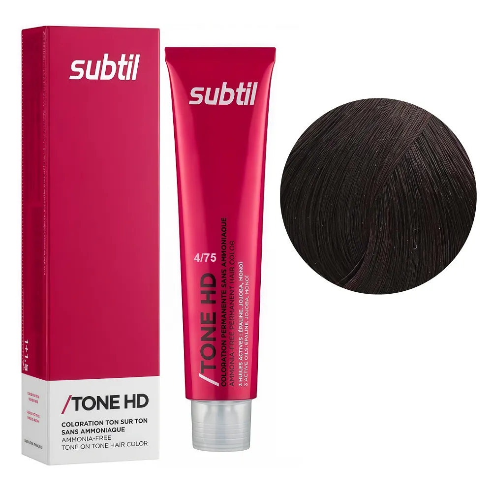 Тонувальна крем-фарба TONE HD має легку консистенцію, що відрізняється м`яким, делікатним впливом на волосся і шкіру голови. Tone HD дозволяє зробити рефреш кольору та підсилення власного тону волосся. Фарба підходить для підтримки необхідного кольору відразу після фарбування, після проведення хімічної завивки, для створення тимчасового відтінку або для фарбування тон-в-тон. В результаті фарбування волосся набуває досконалого вигляду, інтенсивниого яскравого кольору та ідеального блиску. Особливості продукту: 4/75 каштановий шоколад Безаміачна крем-фарба для тонування волосся на лужній основі, 60 мл TONE HD SUBTIL Застосування: 4/75 каштановий шоколад Безаміачна крем-фарба для тонування волосся на лужній основі, 60 мл TONE HD SUBTIL/span> Розвести в неметалевій ємності: 1 частина Subtil Tone HD + 1,5 частини Subtil OXI 2.7%. Наносимо на сухе, немите волосся. Змиваються безаммиачні фарби поступово, легко, рівномірно, через 4-6 тижнів при митті 2 рази в тиждень, завдяки цьому волосся, що відростає не відрізняється від вже забарвленого. Застосовувати фарбу слід, суворо дотримуючись інструкції, яка додається до кожної упаковки.Безаміачна крем-фарба для тонування волосся на лужній основі TONE HD SUBTIL