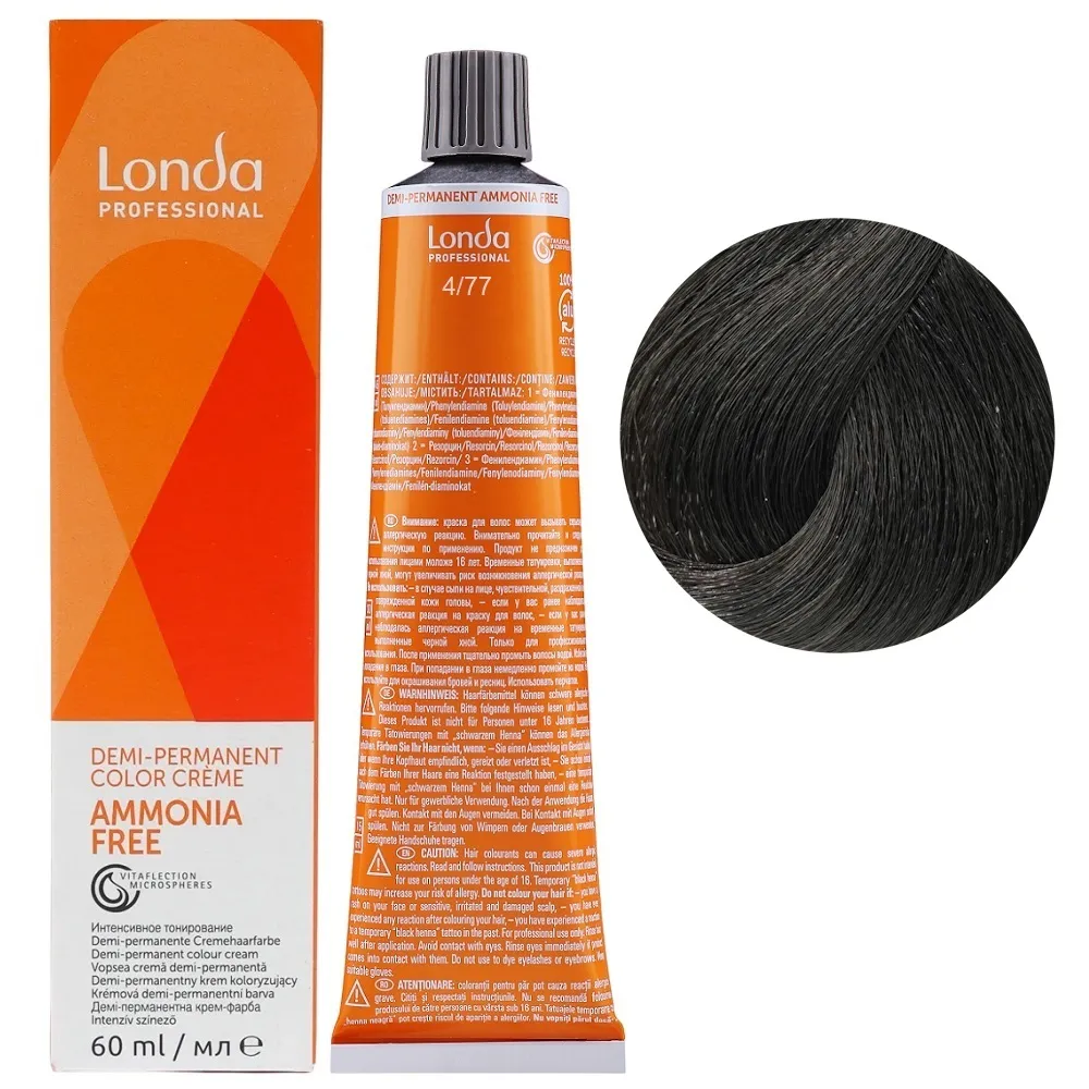 Фарба для інтенсивного тонування без аміаку зі світловідбивними мікросферами Vitaflection створює живе, сяюче волосся з багатовимірним блиском. Demi-Permanent використовує середовище для підлужнення без аміаку та пероксиди низької концентрації, тому прекурсори барвників проникають у волокна волосся менш глибоко. Завдяки цьому структура волосся змінюється менше, ніж при використанні стійких крем-фарб Permanent Color. Особливості продукту: 4/77 середній брюнет інтенсивно-коричневий Демі-перманентна фарба без аміаку, 60 мл Demi-Permanent Color Londa Professional Застосування: 4/77 середній брюнет інтенсивно-коричневий Демі-перманентна фарба без аміаку, 60 мл Demi-Permanent Color Londa Professional Змішати Demi-Permanent Color з емульсією для інтенсивного тонування Demi-Permanent Emulsion Londacolor 1,9% або 4%, в пропорції 1:2. Час витримки залежить від бажаного результату. Важливо! Продукт для професійного застосування. Уважно ознайомтесь з інструкцією.Демі-перманентна фарба без аміаку Demi-Permanent Color Londa Professional