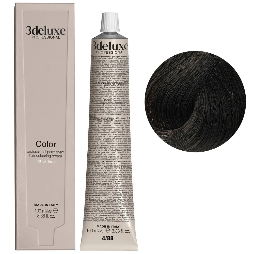 Професійна стійка кремова фарба для волосся Permanent Hair Color 3deluxe з неймовірним відбиттям світла та чудовим захистом, забезпечує волоссю неперевершену якість. Містить технологію 3D Lux, яка забезпечує насичений, яскравий, багатогранний колір: Особливості продукту: 4/88 каштановий середньо-коричневий інтенсивний Фарба для волосся, 100 мл Permanent Hair Color 3Deluxe Professional Активні компоненти: 4/88 каштановий середньо-коричневий інтенсивний Фарба для волосся, 100 мл Permanent Hair Color 3Deluxe Professional Застосування: 4/88 каштановий середньо-коричневий інтенсивний Фарба для волосся, 100 мл Permanent Hair Color 3Deluxe Professional Змішайте в пластмасовому посуді крему-фарбу Color 3deluxe з кремом-окислювачем 1,5%, 3%, 6%, 9% або 12%. Пропорції змішування: для основної палітри відтінків - 1:1,5, для освітлювального ряду - 1:2, для більш насиченого кольору - 1:1. Час витримки залежить від бажаного результату. Важливо! Продукт для професійного застосування. Уважно ознайомтесь з інструкцією.Фарба для волосся Permanent Hair Color 3deluxe Professional