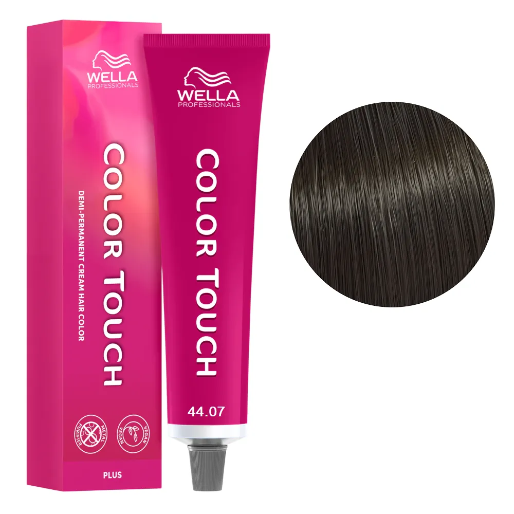 Фарба Color Touch Plus це новий рівень фарбування: багатовимірне тонування волосся. Веганський склад із вмістом до 85% інгредієнтів натурального походження, без аміаку (за винятком Color Touch Plus, що призначена для сивого волосся), робить фарбування максимально делікатним. Особливості продукту: 44/07 середній коричневий натурально-коричневий Фарба для тонування волосся без аміаку (Оновлена формула), 60 мл COLOR TOUCH PLUS Wella Professionals Усі відтінки базової гами Color Touch можна змішувати між собою. Застосування: 44/07 середній коричневий натурально-коричневий Фарба для тонування волосся без аміаку (Оновлена формула), 60 мл COLOR TOUCH PLUS Wella Professionals Час витримки: з теплом 15 хвилин, без тепла 20-25 хвилин. Продукт призначений для професійного використання. Уважно ознайомтесь з інструкцією.Інтенсивна тонувальна фарба COLOR TOUCH PLUS Wella Professionals з оновленою веганською формулою.