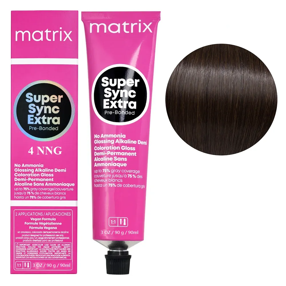 SUPER SYNC EXTRA Pre-Bonded від MATRIX - це інноваційний тонувальний засіб без аміаку, створений для м’якого фарбування та догляду за волоссям. Формула з технологією Pre-Bonded зміцнює внутрішні зв’язки волосини, мінімізує пошкодження та зберігає еластичність навіть після інтенсивних процедур. Продукт забезпечує рівномірне тонування з природним блискомта дарує волоссю доглянутий вигляд. SUPER SYNC EXTRA зафарбовує до 75% сивини. Завдяки відсутності аміаку фарба діє делікатно, не пересушує волосся та підходить навіть для тонкого й ослабленого типу. Результат зберігається до 20 циклів миття голови, поступово та рівномірно вимиваючись без різких переходів. Особливості продукту: 4NNG Шатен натурально-золотистий інтенсивний Тонер для волосся на лужній основі без аміаку, 90 мл SUPER SYNC EXTRA Pre-Bonded MATRIX Застосування: 4NNG Шатен натурально-золотистий інтенсивний Тонер для волосся на лужній основі без аміаку, 90 мл SUPER SYNC EXTRA Pre-Bonded MATRIX Пропорції змішування 1:1 з проявником Matrix Cream Developer 3% (10 Volume). Нанесення на чисте волосся. Час витримки - 20 хвилин при кімнатній температурі. Змити водою. Перед застосуванням уважно ознайомтесь з інструкцією! Для професійного використання!Тонер для волосся на лужній основі без аміаку для фарбування сивини SUPER SYNC EXTRA Pre-Bonded MATRIX