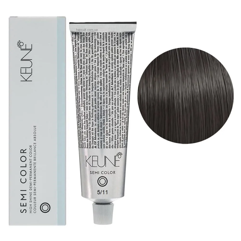 Keune Semi Color - це інноваційна безаміачна крем-фарба для волосся, створена на основі технології Silsoft, що забезпечує стійкий результат без шкоди для структури волосся. Засіб ідеально підходить для тонування, освіження кольору та фарбування до 70% сивини. Формула нового покоління містить активні компоненти, які м’яко відновлюють природний відтінок, роблять волосся гладким, м’яким і еластичним. Завдяки нейтральному pH та відсутності аміаку, фарба підходить навіть для чутливої шкіри голови та волосся після хімічних процедур. Особливості продукту: 5/11 Світло-коричневий попелястий інтенсивний Фарба для тонування волосся без аміаку, 60 мл Demi-Permanent Color SЕМІ COLOR KEUNE Застосування: 5/11 Світло-коричневий попелястий інтенсивний Фарба для тонування волосся без аміаку, 60 мл Demi-Permanent Color SЕМІ COLOR KEUNE Фарбу Keune Semi Color слід змішати з Activator Semi Color (2.25%) або Activator Intense Semi Color (3%) у співвідношенні 1:2. Час витримки 20 хвилин. Продукт для професійного використання. Уважно ознайомтесь з офіційною інструкцією.Фарба для тонування волосся без аміаку Demi-Permanent Color SЕМІ COLOR KEUNE