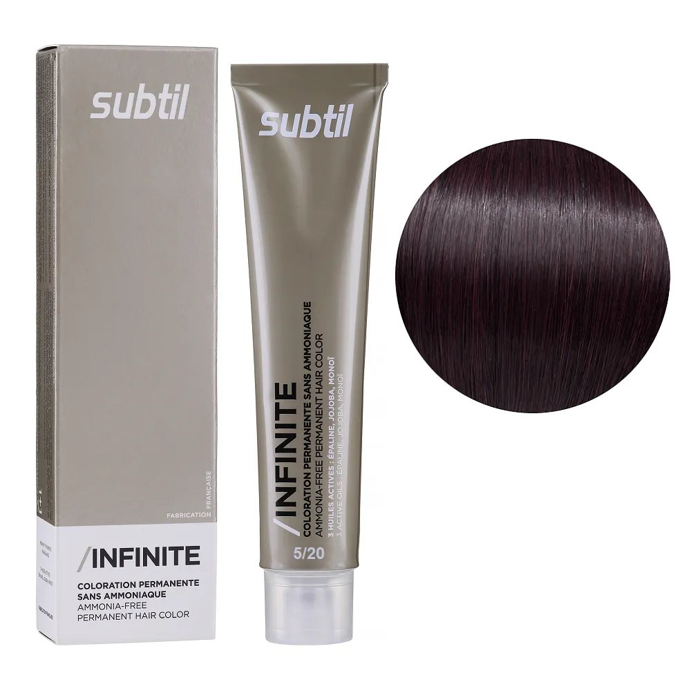 Subtil Infinite - фарба без вмісту аміаку нового покоління, що містить щонайменше 78% інгредієнтів природного походження та трилогію дорогоцінних олій: жожоба, моної, кукурудзяної. Забезпечує 100% зафарбовування сивини, супер блиск та супер стійкість. Безаміачна фарба додає волоссю стійкий і насичений колір, при цьому не ушкоджує і не висушує його. Олії, що входять до складу зволожують і ущільнюють волосся, роблять його блискучим і шовковистим. Щадна формула підходить навіть власницям чутливої шкіри голови. Так само фарба здатна освітлити волосся до трьох рівнів, що є революцією в світі безаміачних фарб. Розкішний колір, гладкість і здоровий блиск без шкоди для волосся. Застосування: 5/20 світлий шатен перламутровий Безаміачна стійка крем-фарба для волосся, 60 мл Permanent Hair Color INFINITE SUBTIL Крем-фарбу потрібно наносити на брудне сухе волосся. Фарбу слід змивати ретельно до повної прозорості води. Час витримки: 5/20 світлий шатен перламутровий Безаміачна стійка крем-фарба для волосся, 60 мл Permanent Hair Color INFINITE SUBTIL Витримати на волоссі від 30 до 35 хвилин, при наявності сивого волосся час впливу можна збільшити на 10 хвилин. Застосовувати фарбу слід, суворо дотримуючись інструкції, яка додається до кожної упаковки.Безаміачна стійка крем-фарба для волосся Permanent Hair Color INFINITE SUBTIL