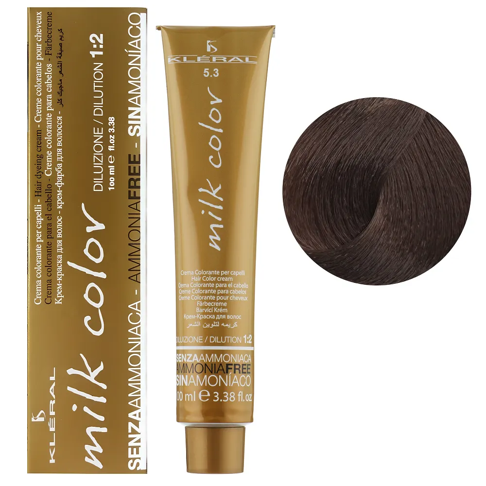 Безаміачна фарба Milk Color, розроблена італійською компанією Kleral System, представлена більше ніж 40 відтінками. Прекрасно забарвлює волосся, у тому числі і сиве (якщо сивини не більше 50%) у близькі до натуральних кольорів. Завдяки своєму щадному складу і компонентам, що доглядають, не пошкоджує структуру волосся, надає їм блиск і м`якість. Milk Color ідеально підходить для пошкодженого волосся. Тюбик містить 100 мл фарби та розрахований на 2 повні нанесення. Рекомендований окислювач - 20-vol стабілізований перекис водню. Для збільшення освітлювальної дії, використовуйте стабілізований перекис водню в 30- або 40-vol емульсії. Особливості продукту: 5/3 Світло-каштановий золотистий Крем-фарба для волосся перманентна без аміаку, 100 мл Milk Color KLERAL System Застосування: 5/3 Світло-каштановий золотистий Крем-фарба для волосся перманентна без аміаку, 100 мл Milk Color KLERAL System Продукт призначений для професійного використання. Уважно ознайомтесь з інструкцією.Крем-фарба для волосся перманентна без аміаку Milk Color KLERAL System