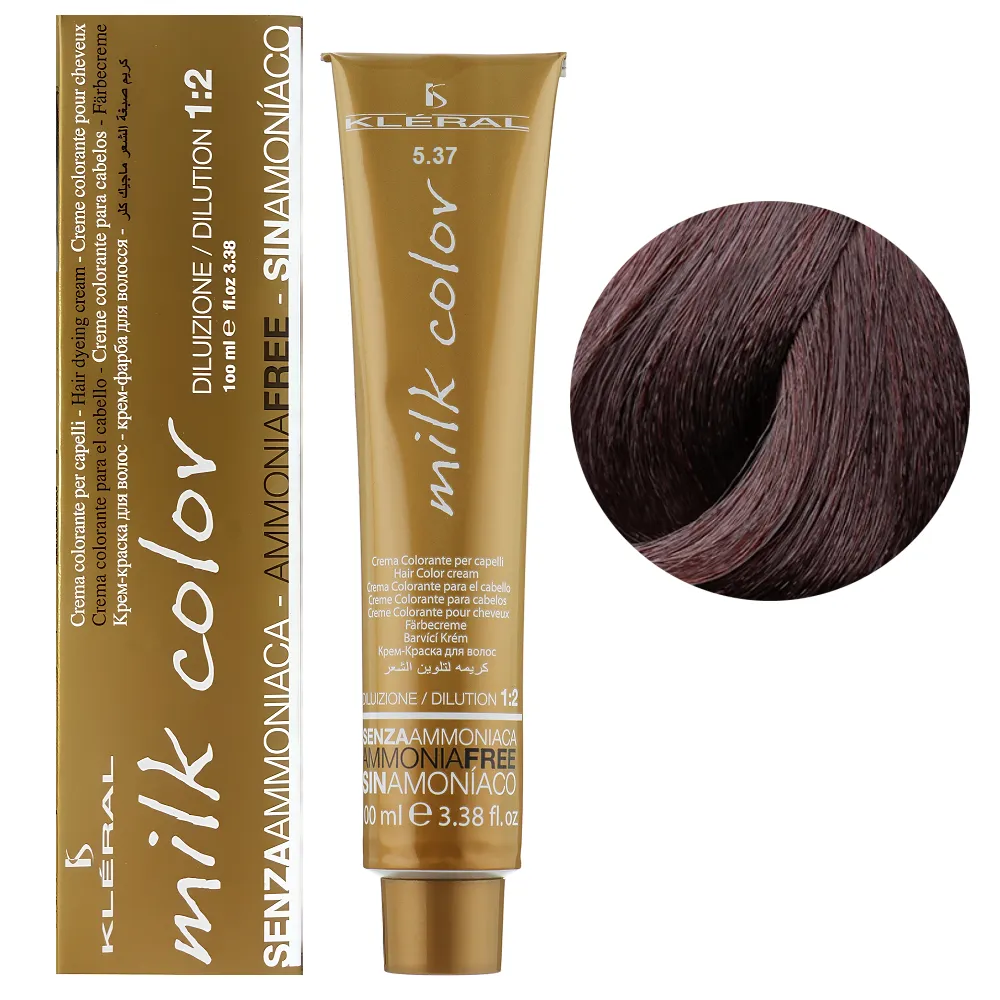 Безаміачна фарба Milk Color, розроблена італійською компанією Kleral System, представлена більше ніж 40 відтінками. Прекрасно забарвлює волосся, у тому числі і сиве (якщо сивини не більше 50%) у близькі до натуральних кольорів. Завдяки своєму щадному складу і компонентам, що доглядають, не пошкоджує структуру волосся, надає їм блиск і м`якість. Milk Color ідеально підходить для пошкодженого волосся. Тюбик містить 100 мл фарби та розрахований на 2 повні нанесення. Рекомендований окислювач - 20-vol стабілізований перекис водню. Для збільшення освітлювальної дії, використовуйте стабілізований перекис водню в 30- або 40-vol емульсії. Особливості продукту: 5/37 Ірисовий світлий шатен Крем-фарба для волосся перманентна без аміаку, 100 мл Milk Color KLERAL System Застосування: 5/37 Ірисовий світлий шатен Крем-фарба для волосся перманентна без аміаку, 100 мл Milk Color KLERAL System Продукт призначений для професійного використання. Уважно ознайомтесь з інструкцією.Крем-фарба для волосся перманентна без аміаку Milk Color KLERAL System