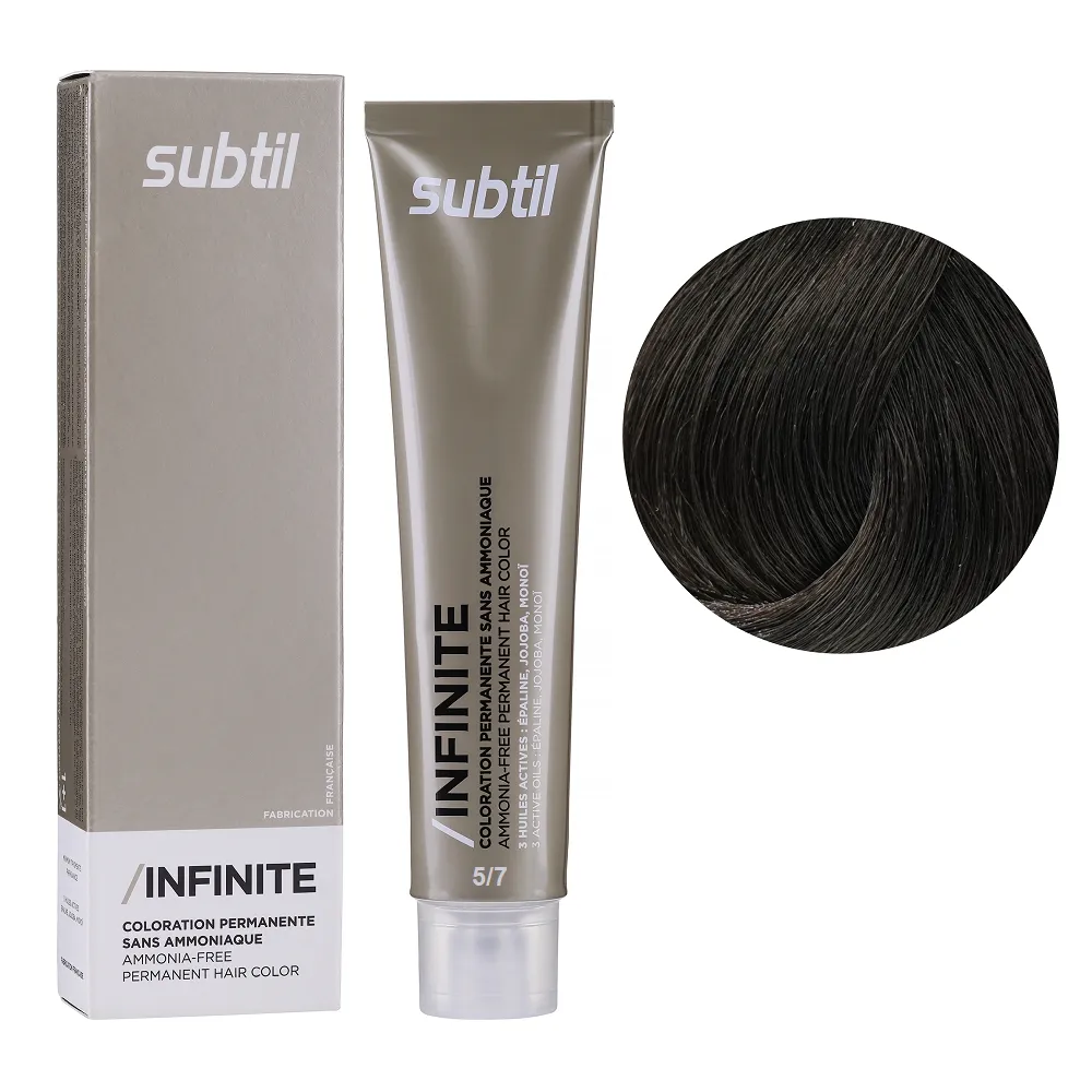 Subtil Infinite - фарба без вмісту аміаку нового покоління, що містить щонайменше 78% інгредієнтів природного походження та трилогію дорогоцінних олій: жожоба, моної, кукурудзяної. Забезпечує 100% зафарбовування сивини, супер блиск та супер стійкість. Безаміачна фарба додає волоссю стійкий і насичений колір, при цьому не ушкоджує і не висушує його. Олії, що входять до складу зволожують і ущільнюють волосся, роблять його блискучим і шовковистим. Щадна формула підходить навіть власницям чутливої шкіри голови. Так само фарба здатна освітлити волосся до трьох рівнів, що є революцією в світі безаміачних фарб. Розкішний колір, гладкість і здоровий блиск без шкоди для волосся. Застосування: 5/7 світлий шатен коричневий Безаміачна стійка крем-фарба для волосся, 60 мл Permanent Hair Color INFINITE SUBTIL Крем-фарбу потрібно наносити на брудне сухе волосся. Фарбу слід змивати ретельно до повної прозорості води. Час витримки: 5/7 світлий шатен коричневий Безаміачна стійка крем-фарба для волосся, 60 мл Permanent Hair Color INFINITE SUBTIL Витримати на волоссі від 30 до 35 хвилин, при наявності сивого волосся час впливу можна збільшити на 10 хвилин. Застосовувати фарбу слід, суворо дотримуючись інструкції, яка додається до кожної упаковки.Безаміачна стійка крем-фарба для волосся Permanent Hair Color INFINITE SUBTIL