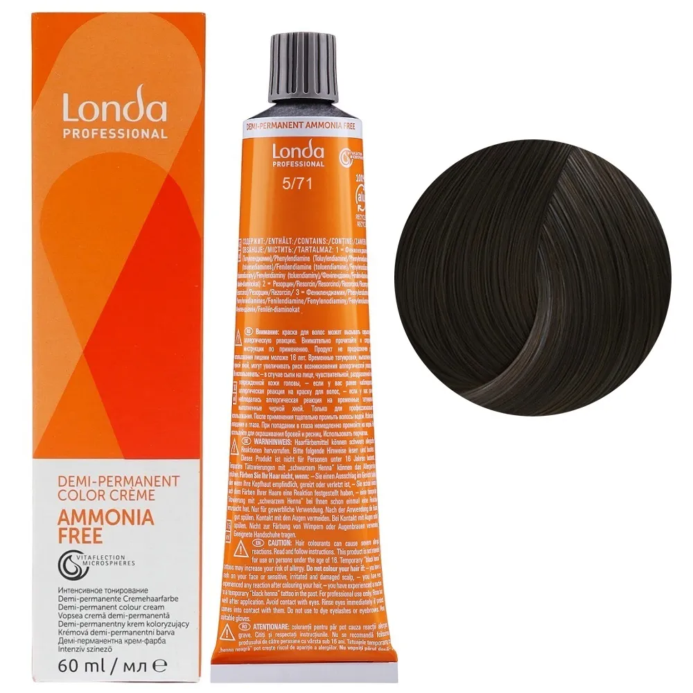 Фарба для інтенсивного тонування без аміаку зі світловідбивними мікросферами Vitaflection створює живе, сяюче волосся з багатовимірним блиском. Demi-Permanent використовує середовище для підлужнення без аміаку та пероксиди низької концентрації, тому прекурсори барвників проникають у волокна волосся менш глибоко. Завдяки цьому структура волосся змінюється менше, ніж при використанні стійких крем-фарб Permanent Color. Особливості продукту: 5/71 світлий брюнет коричнево-попелястий Демі-перманентна фарба без аміаку, 60 мл Demi-Permanent Color Londa Professional Застосування: 5/71 світлий брюнет коричнево-попелястий Демі-перманентна фарба без аміаку, 60 мл Demi-Permanent Color Londa Professional Змішати Demi-Permanent Color з емульсією для інтенсивного тонування Demi-Permanent Emulsion Londacolor 1,9% або 4%, в пропорції 1:2. Час витримки залежить від бажаного результату. Важливо! Продукт для професійного застосування. Уважно ознайомтесь з інструкцією.Демі-перманентна фарба без аміаку Demi-Permanent Color Londa Professional