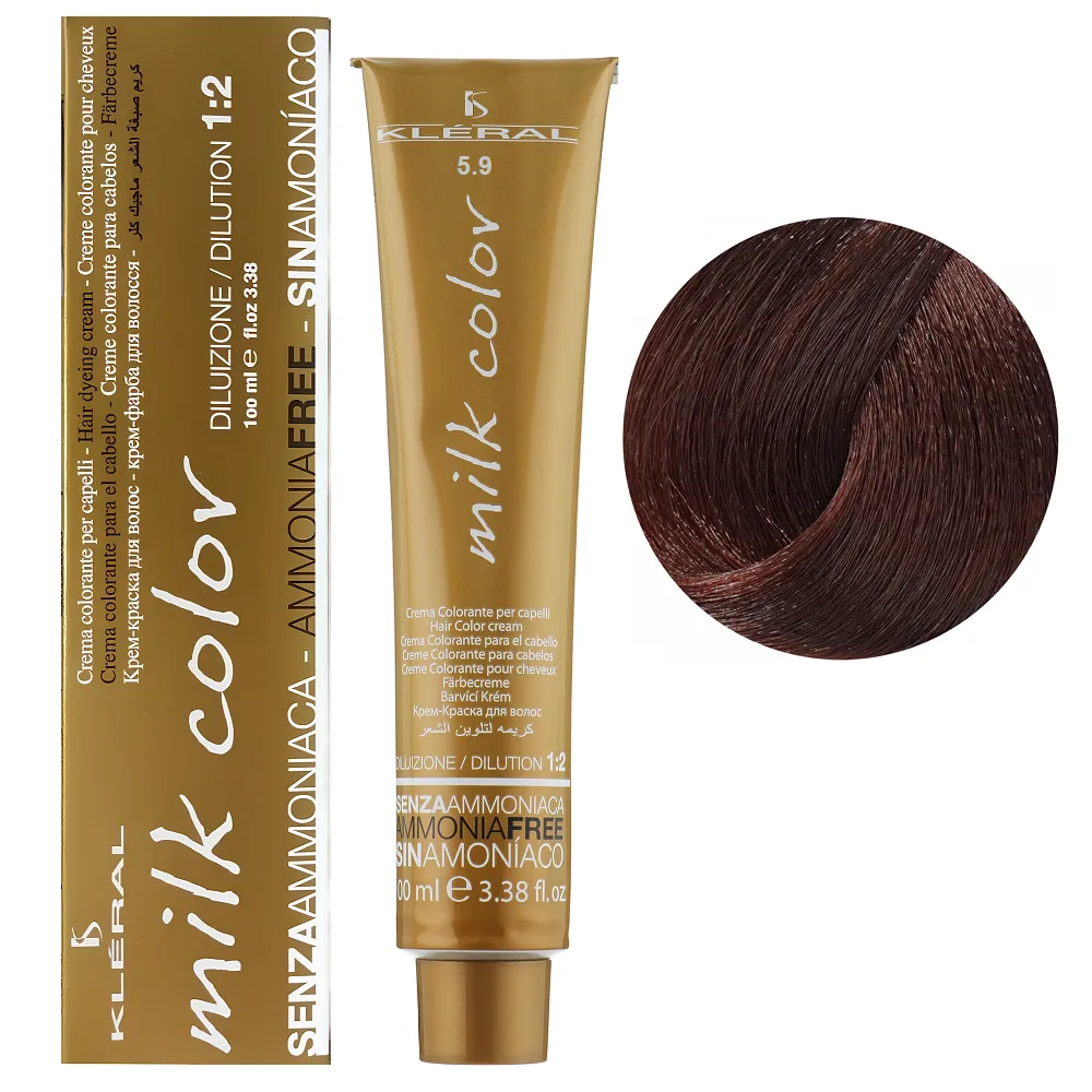 Безаміачна фарба Milk Color, розроблена італійською компанією Kleral System, представлена більше ніж 40 відтінками. Прекрасно забарвлює волосся, у тому числі і сиве (якщо сивини не більше 50%) у близькі до натуральних кольорів. Завдяки своєму щадному складу і компонентам, що доглядають, не пошкоджує структуру волосся, надає їм блиск і м`якість. Milk Color ідеально підходить для пошкодженого волосся. Тюбик містить 100 мл фарби та розрахований на 2 повні нанесення. Рекомендований окислювач - 20-vol стабілізований перекис водню. Для збільшення освітлювальної дії, використовуйте стабілізований перекис водню в 30- або 40-vol емульсії. Особливості продукту: 5/9 Світло-каштановий шоколад Крем-фарба для волосся перманентна без аміаку, 100 мл Milk Color KLERAL System Застосування: 5/9 Світло-каштановий шоколад Крем-фарба для волосся перманентна без аміаку, 100 мл Milk Color KLERAL System Продукт призначений для професійного використання. Уважно ознайомтесь з інструкцією.Крем-фарба для волосся перманентна без аміаку Milk Color KLERAL System