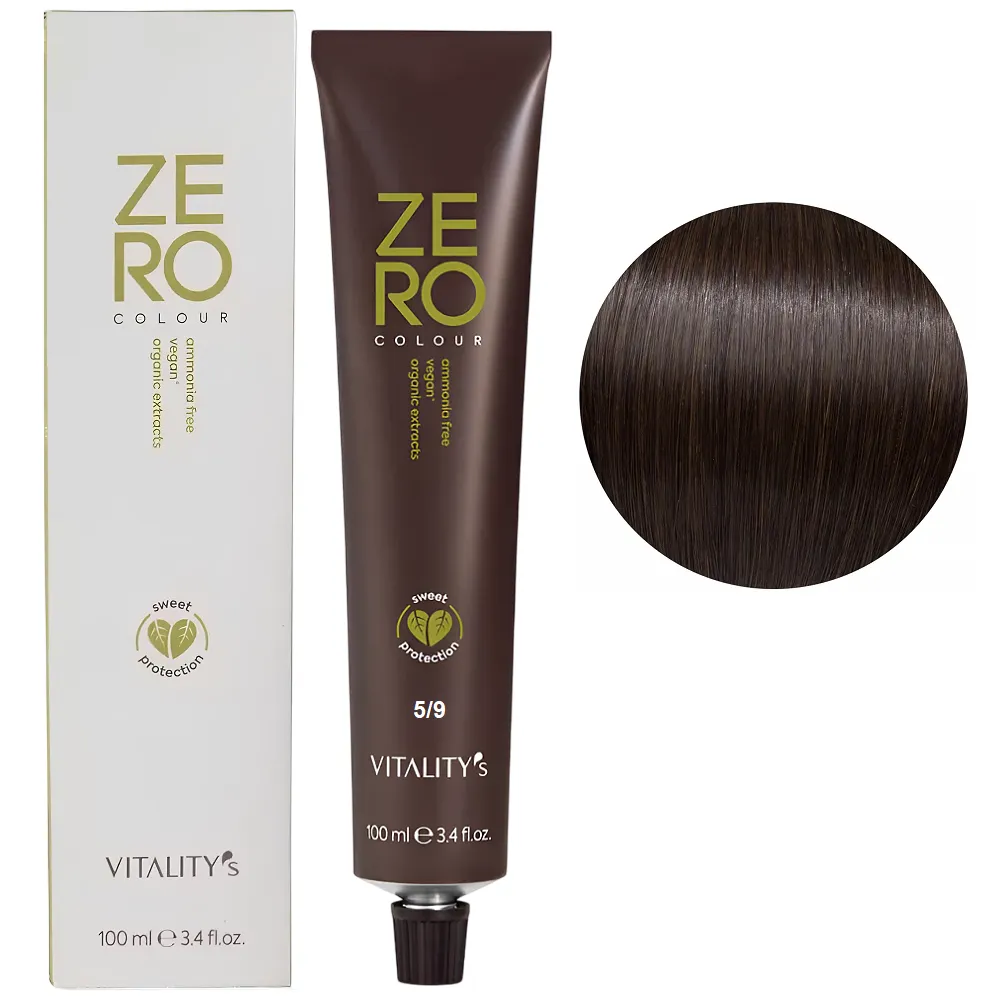 Zero Colour – це веганська фарба з високим натуральним індексом, зі зниженим ризиком подразнення та алергії. Завдяки антиоксидантним та пом`якшувальним властивостям, вона допомагає захистити колір та робить волосся м`яким і шовковистим. Формула без аміаку делікатно відновлює волосся для багатогранного, насиченого та сяючого кольору. Здатна задовольнити бажання кольору всіх жінок, навіть тих, хто має проблеми з чутливістю шкіри. Результат зберігається до 6 тижнів. Зменшуються подразнення та сухість шкіри голови, покращується загальний стан волосся після фарбування. Особливості продукту: 5/9 світло-коричневий каштановий Крем-фарба для волосся без аміаку, 100 мл ZERO VEGAN Vitality`s Застосування: 5/9 світло-коричневий каштановий Крем-фарба для волосся без аміаку, 100 мл ZERO VEGAN Vitality`s Важливо! Продукт для професійного застосування. Уважно ознайомтесь з інструкцією..Крем-фарба для волосся без аміаку ZERO VEGAN Vitality`s