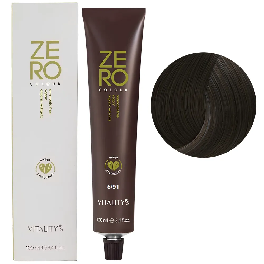 Zero Colour – це веганська фарба з високим натуральним індексом, зі зниженим ризиком подразнення та алергії. Завдяки антиоксидантним та пом`якшувальним властивостям, вона допомагає захистити колір та робить волосся м`яким і шовковистим. Формула без аміаку делікатно відновлює волосся для багатогранного, насиченого та сяючого кольору. Здатна задовольнити бажання кольору всіх жінок, навіть тих, хто має проблеми з чутливістю шкіри. Результат зберігається до 6 тижнів. Зменшуються подразнення та сухість шкіри голови, покращується загальний стан волосся після фарбування. Особливості продукту: 5/91 світло-коричневий каштаново-попелястий Крем-фарба для волосся без аміаку, 100 мл ZERO VEGAN Vitality`s Застосування: 5/91 світло-коричневий каштаново-попелястий Крем-фарба для волосся без аміаку, 100 мл ZERO VEGAN Vitality`s Важливо! Продукт для професійного застосування. Уважно ознайомтесь з інструкцією..Крем-фарба для волосся без аміаку ZERO VEGAN Vitality`s