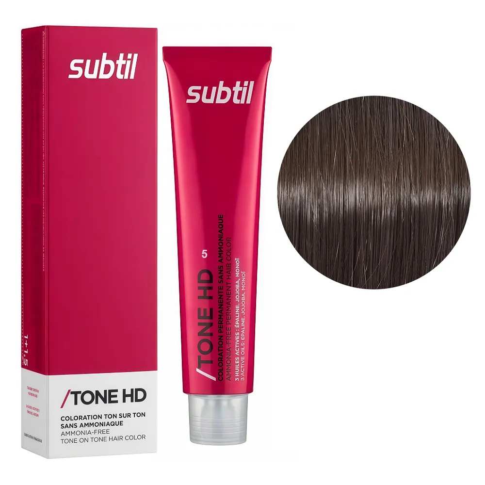 Тонувальна крем-фарба TONE HD має легку консистенцію, що відрізняється м`яким, делікатним впливом на волосся і шкіру голови. Tone HD дозволяє зробити рефреш кольору та підсилення власного тону волосся. Фарба підходить для підтримки необхідного кольору відразу після фарбування, після проведення хімічної завивки, для створення тимчасового відтінку або для фарбування тон-в-тон. В результаті фарбування волосся набуває досконалого вигляду, інтенсивниого яскравого кольору та ідеального блиску. Особливості продукту: 5 світлий шатен Безаміачна крем-фарба для тонування волосся на лужній основі, 60 мл TONE HD SUBTIL Застосування: 5 світлий шатен Безаміачна крем-фарба для тонування волосся на лужній основі, 60 мл TONE HD SUBTIL/span> Розвести в неметалевій ємності: 1 частина Subtil Tone HD + 1,5 частини Subtil OXI 2.7%. Наносимо на сухе, немите волосся. Змиваються безаммиачні фарби поступово, легко, рівномірно, через 4-6 тижнів при митті 2 рази в тиждень, завдяки цьому волосся, що відростає не відрізняється від вже забарвленого. Застосовувати фарбу слід, суворо дотримуючись інструкції, яка додається до кожної упаковки.Безаміачна крем-фарба для тонування волосся на лужній основі TONE HD SUBTIL