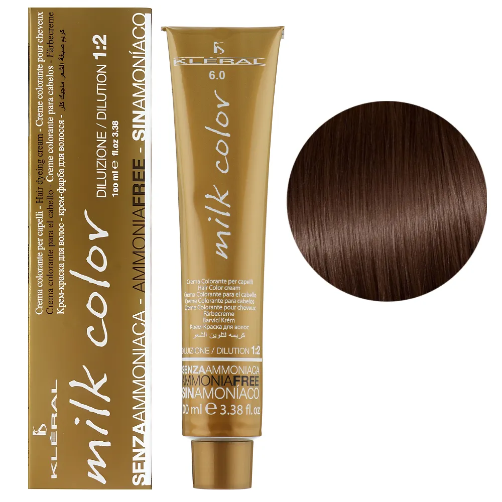 Безаміачна фарба Milk Color, розроблена італійською компанією Kleral System, представлена більше ніж 40 відтінками. Прекрасно забарвлює волосся, у тому числі і сиве (якщо сивини не більше 50%) у близькі до натуральних кольорів. Завдяки своєму щадному складу і компонентам, що доглядають, не пошкоджує структуру волосся, надає їм блиск і м`якість. Milk Color ідеально підходить для пошкодженого волосся. Тюбик містить 100 мл фарби та розрахований на 2 повні нанесення. Рекомендований окислювач - 20-vol стабілізований перекис водню. Для збільшення освітлювальної дії, використовуйте стабілізований перекис водню в 30- або 40-vol емульсії. Особливості продукту: 6/0 Темно-русявий Крем-фарба для волосся перманентна без аміаку, 100 мл Milk Color KLERAL System Застосування: 6/0 Темно-русявий Крем-фарба для волосся перманентна без аміаку, 100 мл Milk Color KLERAL System Продукт призначений для професійного використання. Уважно ознайомтесь з інструкцією.Крем-фарба для волосся перманентна без аміаку Milk Color KLERAL System
