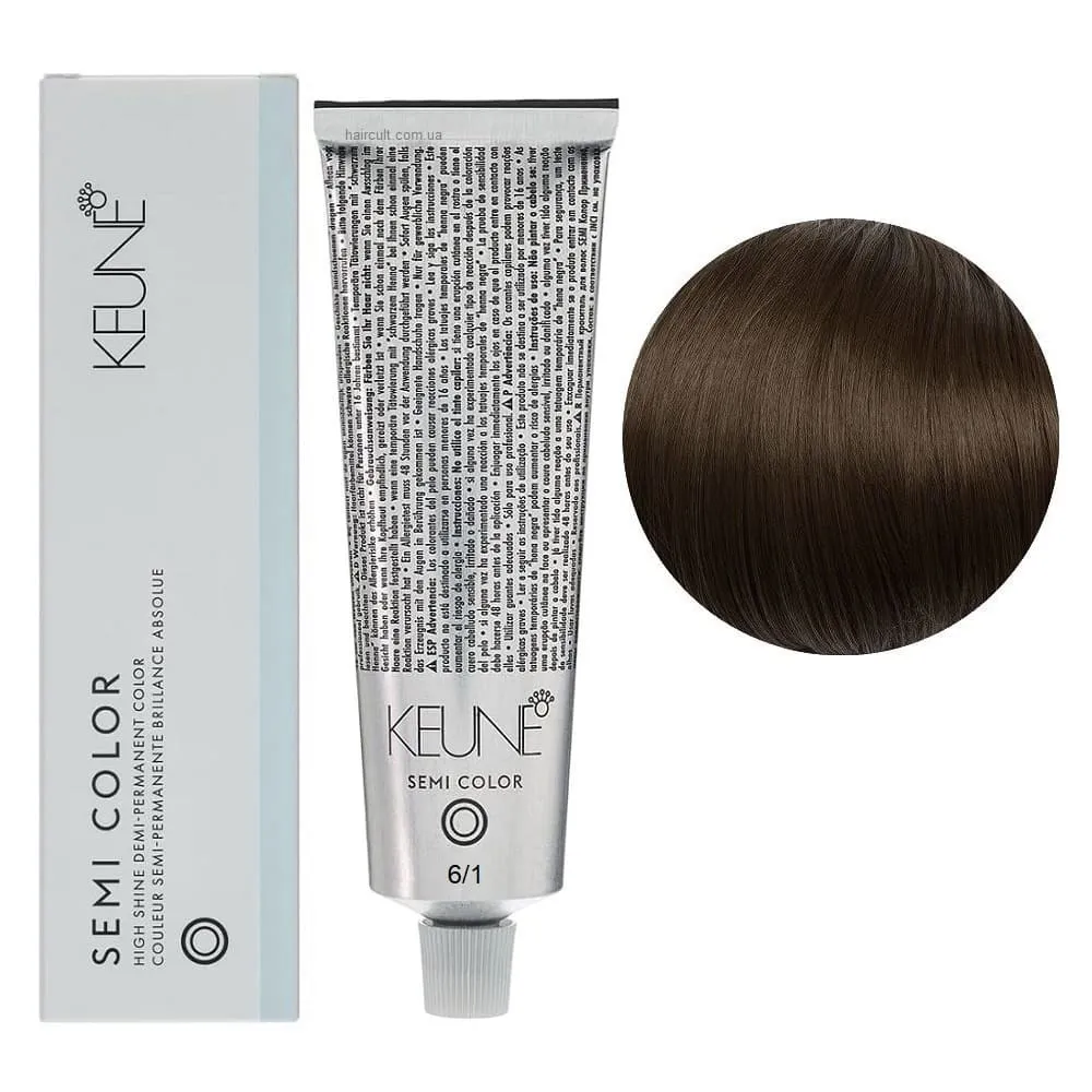Keune Semi Color - це інноваційна безаміачна крем-фарба для волосся, створена на основі технології Silsoft, що забезпечує стійкий результат без шкоди для структури волосся. Засіб ідеально підходить для тонування, освіження кольору та фарбування до 70% сивини. Формула нового покоління містить активні компоненти, які м’яко відновлюють природний відтінок, роблять волосся гладким, м’яким і еластичним. Завдяки нейтральному pH та відсутності аміаку, фарба підходить навіть для чутливої шкіри голови та волосся після хімічних процедур. Особливості продукту: 6/1 Темний блондин попелястий Фарба для тонування волосся без аміаку, 60 мл Demi-Permanent Color SЕМІ COLOR KEUNE Застосування: 6/1 Темний блондин попелястий Фарба для тонування волосся без аміаку, 60 мл Demi-Permanent Color SЕМІ COLOR KEUNE Фарбу Keune Semi Color слід змішати з Activator Semi Color (2.25%) або Activator Intense Semi Color (3%) у співвідношенні 1:2. Час витримки 20 хвилин. Продукт для професійного використання. Уважно ознайомтесь з офіційною інструкцією.Фарба для тонування волосся без аміаку Demi-Permanent Color SЕМІ COLOR KEUNE