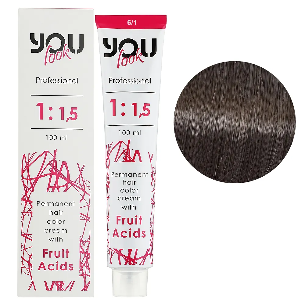 Стійка фарба для волосся бренду You look Professional – це можливість отримати розкішний відтінок і водночас не отримати ушкодження у вигляді сухості, ламкості та посічених кінчиків. Багата палітра відтінків і спеціальна стійка формула відкриють для вас нові можливості для експериментів з різними кольорами. Засіб збагачений фруктовими кислотами, які заспокоюють шкіру голови та запобігають появі пошкоджень структури під час фарбування. Після застосування фарби ваше волосся буде ідеальним, насиченим, яскравим і блискучим. Особливості продукту: 6/1 темний блондин попелястий Крем-фарба стійка з фруктовими кислотами, 100 мл You look Professional Застосування: 6/1 темний блондин попелястий Крем-фарба стійка з фруктовими кислотами, 100 мл You look Professional Пропорції змішування фарби You look з окислювачем 1,5%, 3%, 6%, 9%, 12% : Час витримки залежить від бажаного результату. Важливо! Продукт для професійного застосування. Уважно ознайомтесь з інструкцією.Крем-фарба стійка з фруктовими кислотами You look Professional