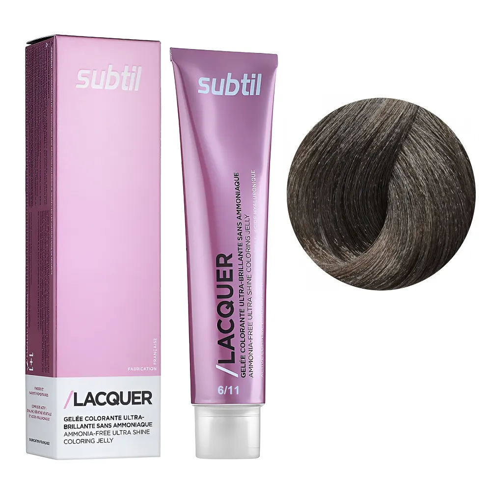 Subtil Lacquer - це фарба для волосся, створена без використання аміаку, на основі гілауроновой кислоти, рослинного кератину і EPOLINE - запатентованої формули (кукурудзяна олія + кисень). З цією фарбою тепер ви можете забути про процедуру відновлення кератину - фарбування і насичення волосся кератином відбувається одночасно і всього за 20 хвилин. Формула Lacquer містить також компоненти, що захищають шкіру, це робить фарбу доступною для застосування при дуже чутливій шкірі голови. Особливості продукту: 6/11 темний блондин інтенсивний попелястий Безаміачна тонувальна гелева фарба на кислотній основі, 60 мл LACQUER SUBTIL Застосування: 6/11 темний блондин інтенсивний попелястий Безаміачна тонувальна гелева фарба на кислотній основі, 60 мл LACQUER SUBTIL Час витримки: 6/11 темний блондин інтенсивний попелястий Безаміачна тонувальна гелева фарба на кислотній основі, 60 мл LACQUER SUBTIL Витримати на волоссі 20 хвилин після нанесення на коріння. Застосовувати фарбу слід, суворо дотримуючись інструкції, яка додається до кожної упаковки.Безаміачна тонувальна гелева фарба на кислотній основі LACQUER SUBTIL