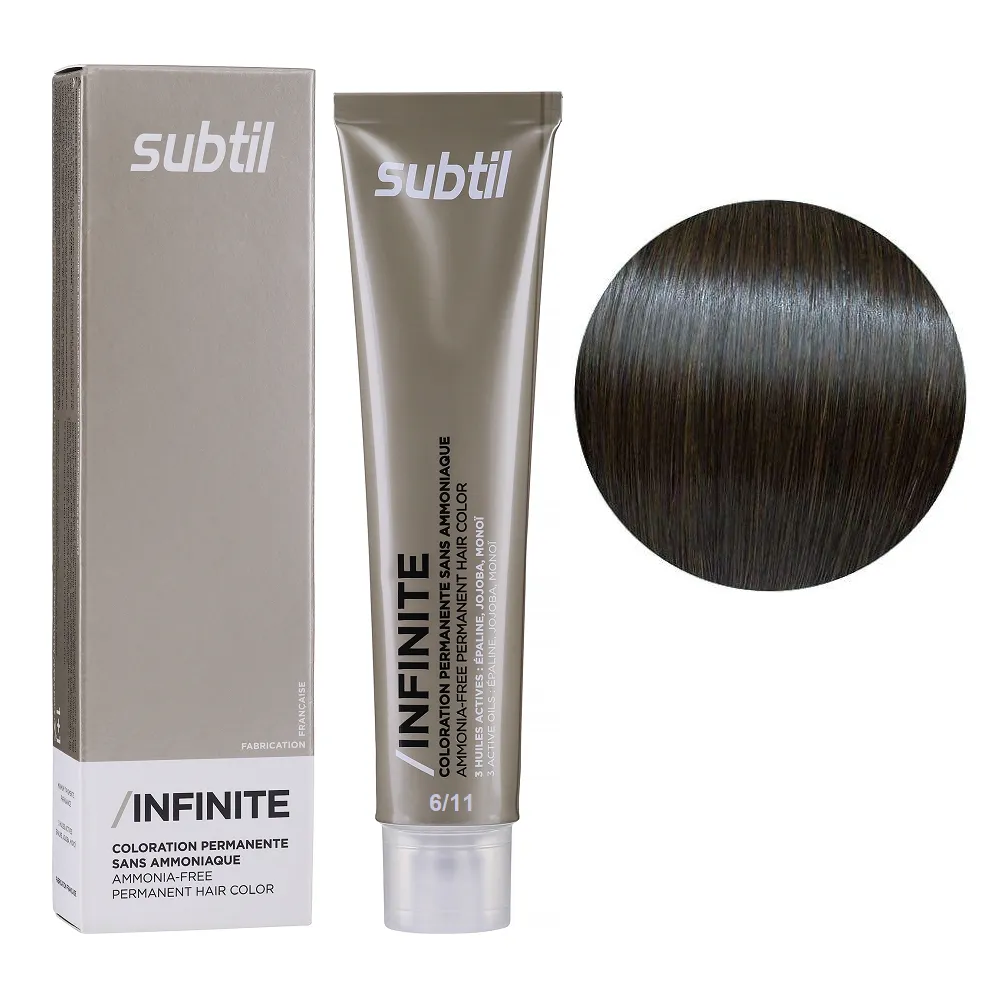 Subtil Infinite - фарба без вмісту аміаку нового покоління, що містить щонайменше 78% інгредієнтів природного походження та трилогію дорогоцінних олій: жожоба, моної, кукурудзяної. Забезпечує 100% зафарбовування сивини, супер блиск та супер стійкість. Безаміачна фарба додає волоссю стійкий і насичений колір, при цьому не ушкоджує і не висушує його. Олії, що входять до складу зволожують і ущільнюють волосся, роблять його блискучим і шовковистим. Щадна формула підходить навіть власницям чутливої шкіри голови. Так само фарба здатна освітлити волосся до трьох рівнів, що є революцією в світі безаміачних фарб. Розкішний колір, гладкість і здоровий блиск без шкоди для волосся. Застосування: 6/11 темний блондин інтенсивний попелястий Безаміачна стійка крем-фарба для волосся, 60 мл Permanent Hair Color INFINITE SUBTIL Крем-фарбу потрібно наносити на брудне сухе волосся. Фарбу слід змивати ретельно до повної прозорості води. Час витримки: 6/11 темний блондин інтенсивний попелястий Безаміачна стійка крем-фарба для волосся, 60 мл Permanent Hair Color INFINITE SUBTIL Витримати на волоссі від 30 до 35 хвилин, при наявності сивого волосся час впливу можна збільшити на 10 хвилин. Застосовувати фарбу слід, суворо дотримуючись інструкції, яка додається до кожної упаковки.Безаміачна крем-фарба для волосся Permanent Hair Color INFINITE SUBTIL