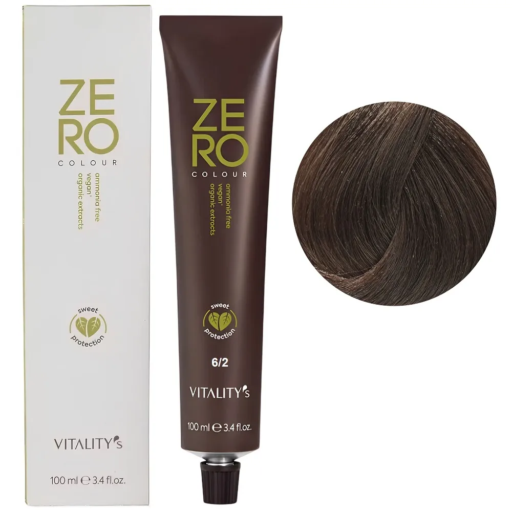 Zero Colour – це веганська фарба з високим натуральним індексом, зі зниженим ризиком подразнення та алергії. Завдяки антиоксидантним та пом`якшувальним властивостям, вона допомагає захистити колір та робить волосся м`яким і шовковистим. Формула без аміаку делікатно відновлює волосся для багатогранного, насиченого та сяючого кольору. Здатна задовольнити бажання кольору всіх жінок, навіть тих, хто має проблеми з чутливістю шкіри. Результат зберігається до 6 тижнів. Зменшуються подразнення та сухість шкіри голови, покращується загальний стан волосся після фарбування. Особливості продукту: 6/2 темний блондин бежевий Крем-фарба для волосся без аміаку, 100 мл ZERO VEGAN Vitality`s Застосування: 6/2 темний блондин бежевий Крем-фарба для волосся без аміаку, 100 мл ZERO VEGAN Vitality`s Важливо! Продукт для професійного застосування. Уважно ознайомтесь з інструкцією..Крем-фарба для волосся без аміаку ZERO VEGAN Vitality`s