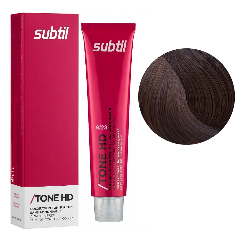 Тонувальна крем-фарба TONE HD має легку консистенцію, що відрізняється м`яким, делікатним впливом на волосся і шкіру голови. Tone HD дозволяє зробити рефреш кольору та підсилення власного тону волосся. Фарба підходить для підтримки необхідного кольору відразу після фарбування, після проведення хімічної завивки, для створення тимчасового відтінку або для фарбування тон-в-тон. В результаті фарбування волосся набуває досконалого вигляду, інтенсивниого яскравого кольору та ідеального блиску. Особливості продукту: 6/23 роза пустелі Безаміачна крем-фарба для тонування волосся на лужній основі, 60 мл TONE HD SUBTIL Застосування: 6/23 роза пустелі Безаміачна крем-фарба для тонування волосся на лужній основі, 60 мл TONE HD SUBTIL/span> Розвести в неметалевій ємності: 1 частина Subtil Tone HD + 1,5 частини Subtil OXI 2.7%. Наносимо на сухе, немите волосся. Змиваються безаммиачні фарби поступово, легко, рівномірно, через 4-6 тижнів при митті 2 рази в тиждень, завдяки цьому волосся, що відростає не відрізняється від вже забарвленого. Застосовувати фарбу слід, суворо дотримуючись інструкції, яка додається до кожної упаковки.Безаміачна крем-фарба для тонування волосся на лужній основі TONE HD SUBTIL