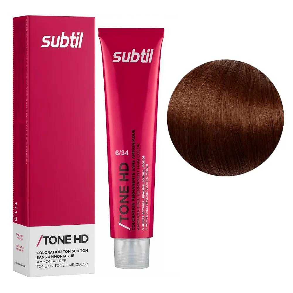 Тонувальна крем-фарба TONE HD має легку консистенцію, що відрізняється м`яким, делікатним впливом на волосся і шкіру голови. Tone HD дозволяє зробити рефреш кольору та підсилення власного тону волосся. Фарба підходить для підтримки необхідного кольору відразу після фарбування, після проведення хімічної завивки, для створення тимчасового відтінку або для фарбування тон-в-тон. В результаті фарбування волосся набуває досконалого вигляду, інтенсивниого яскравого кольору та ідеального блиску. Особливості продукту: 6/34 кориця Безаміачна крем-фарба для тонування волосся на лужній основі, 60 мл TONE HD SUBTIL Застосування: 6/34 кориця Безаміачна крем-фарба для тонування волосся на лужній основі, 60 мл TONE HD SUBTIL/span> Розвести в неметалевій ємності: 1 частина Subtil Tone HD + 1,5 частини Subtil OXI 2.7%. Наносимо на сухе, немите волосся. Змиваються безаммиачні фарби поступово, легко, рівномірно, через 4-6 тижнів при митті 2 рази в тиждень, завдяки цьому волосся, що відростає не відрізняється від вже забарвленого. Застосовувати фарбу слід, суворо дотримуючись інструкції, яка додається до кожної упаковки.Безаміачна крем-фарба для тонування волосся на лужній основі TONE HD SUBTIL