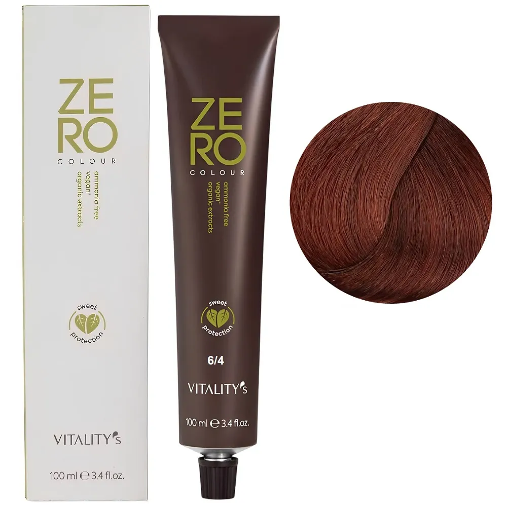Zero Colour – це веганська фарба з високим натуральним індексом, зі зниженим ризиком подразнення та алергії. Завдяки антиоксидантним та пом`якшувальним властивостям, вона допомагає захистити колір та робить волосся м`яким і шовковистим. Формула без аміаку делікатно відновлює волосся для багатогранного, насиченого та сяючого кольору. Здатна задовольнити бажання кольору всіх жінок, навіть тих, хто має проблеми з чутливістю шкіри. Результат зберігається до 6 тижнів. Зменшуються подразнення та сухість шкіри голови, покращується загальний стан волосся після фарбування. Особливості продукту: 6/4 темний блондин мідний Крем-фарба для волосся без аміаку, 100 мл ZERO VEGAN Vitality`s Застосування: 6/4 темний блондин мідний Крем-фарба для волосся без аміаку, 100 мл ZERO VEGAN Vitality`s Важливо! Продукт для професійного застосування. Уважно ознайомтесь з інструкцією..Крем-фарба для волосся без аміаку ZERO VEGAN Vitality`s