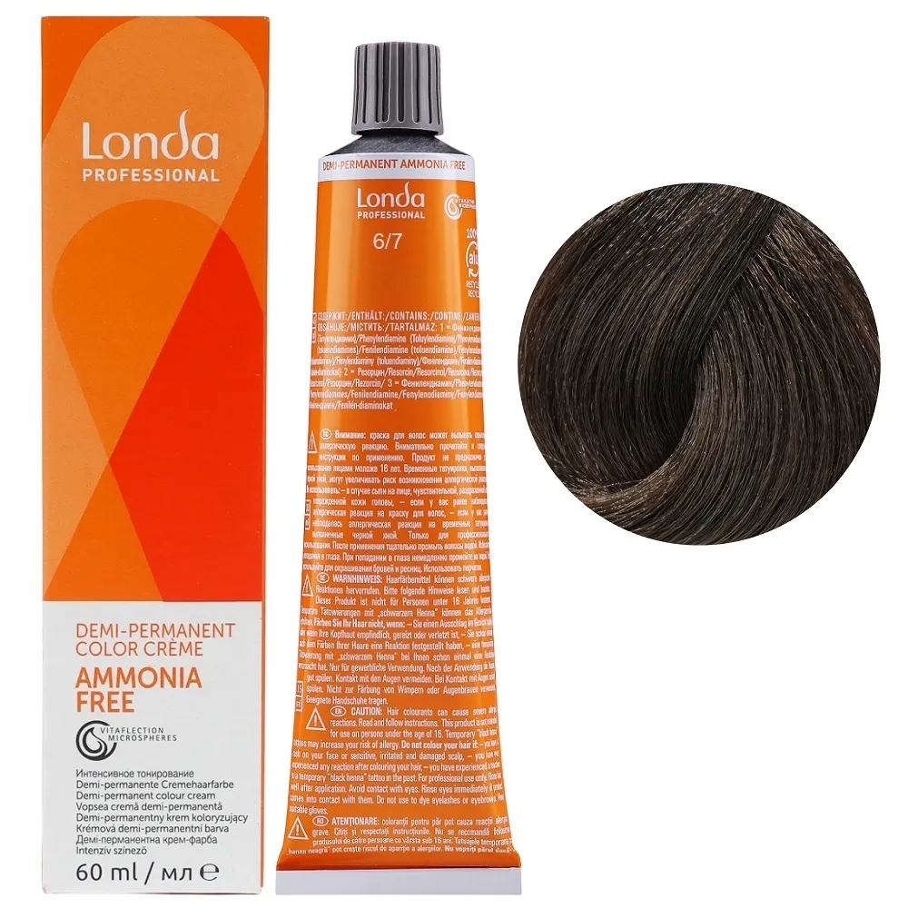 Фарба для інтенсивного тонування без аміаку зі світловідбивними мікросферами Vitaflection створює живе, сяюче волосся з багатовимірним блиском. Demi-Permanent використовує середовище для підлужнення без аміаку та пероксиди низької концентрації, тому прекурсори барвників проникають у волокна волосся менш глибоко. Завдяки цьому структура волосся змінюється менше, ніж при використанні стійких крем-фарб Permanent Color. Особливості продукту: 6/7 темний блондин коричневий Демі-перманентна фарба без аміаку, 60 мл Demi-Permanent Color Londa Professional Застосування: 6/7 темний блондин коричневий Демі-перманентна фарба без аміаку, 60 мл Demi-Permanent Color Londa Professional Змішати Demi-Permanent Color з емульсією для інтенсивного тонування Demi-Permanent Emulsion Londacolor 1,9% або 4%, в пропорції 1:2. Час витримки залежить від бажаного результату. Важливо! Продукт для професійного застосування. Уважно ознайомтесь з інструкцією.Демі-перманентна фарба без аміаку Demi-Permanent Color Londa Professional