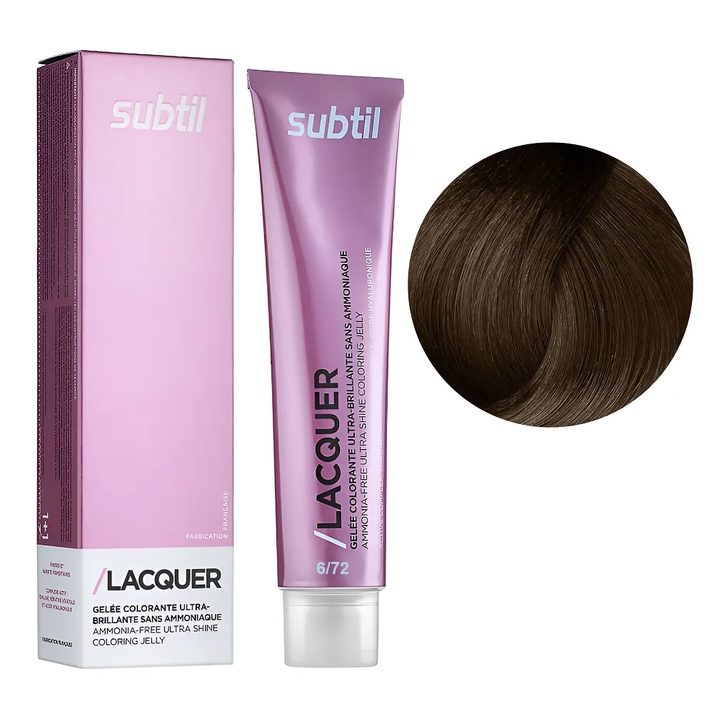Subtil Lacquer - це фарба для волосся, створена без використання аміаку, на основі гілауроновой кислоти, рослинного кератину і EPOLINE - запатентованої формули (кукурудзяна олія + кисень). З цією фарбою тепер ви можете забути про процедуру відновлення кератину - фарбування і насичення волосся кератином відбувається одночасно і всього за 20 хвилин. Формула Lacquer містить також компоненти, що захищають шкіру, це робить фарбу доступною для застосування при дуже чутливій шкірі голови. Особливості продукту: 6/72 темний блондин коричнево-перлинний Безаміачна тонувальна гелева фарба на кислотній основі, 60 мл LACQUER SUBTIL Застосування: 6/72 темний блондин коричнево-перлинний Безаміачна тонувальна гелева фарба на кислотній основі, 60 мл LACQUER SUBTIL Час витримки: 6/72 темний блондин коричнево-перлинний Безаміачна тонувальна гелева фарба на кислотній основі, 60 мл LACQUER SUBTIL Витримати на волоссі 20 хвилин після нанесення на коріння. Застосовувати фарбу слід, суворо дотримуючись інструкції, яка додається до кожної упаковки.Безаміачна тонувальна гелева фарба на кислотній основі LACQUER SUBTIL
