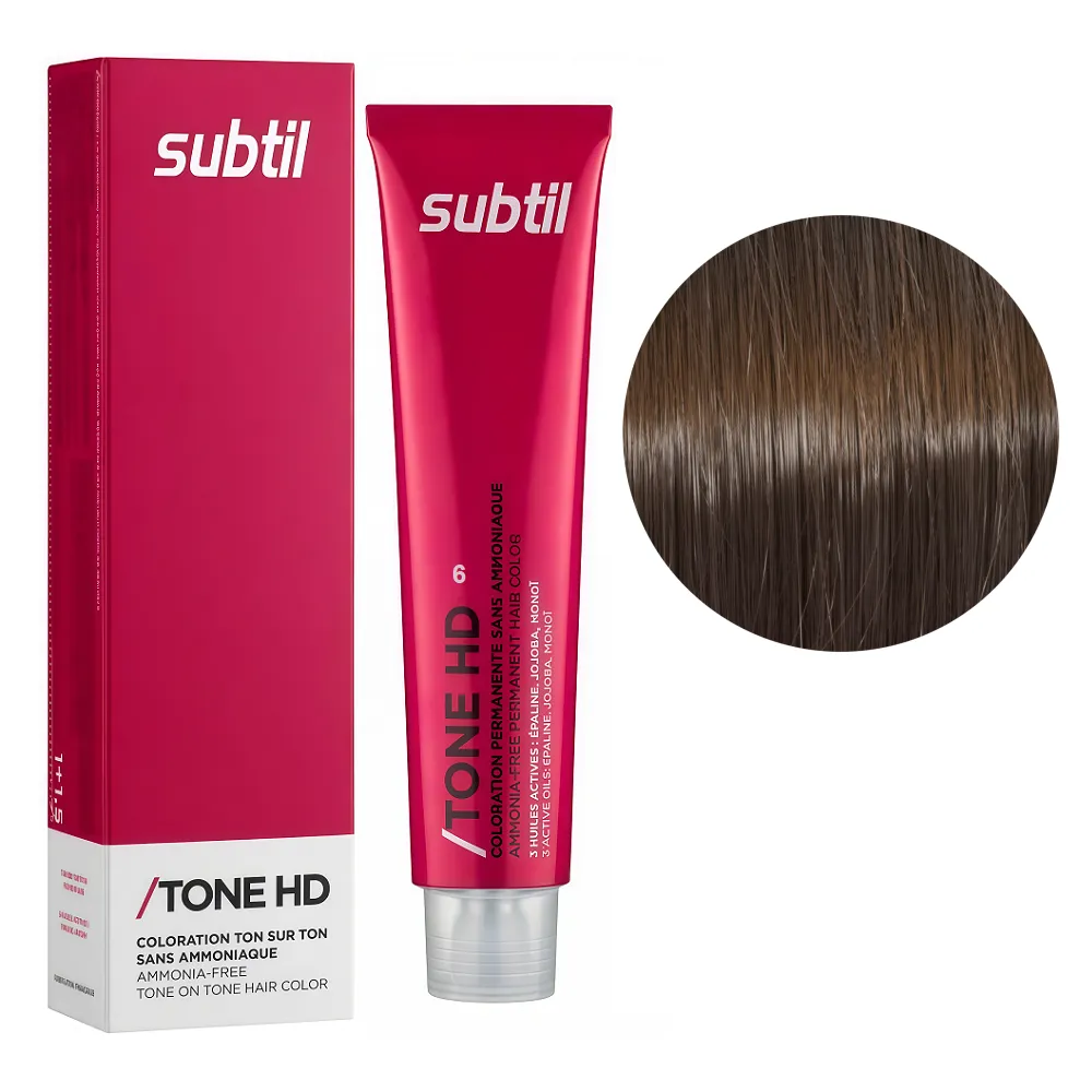 Тонувальна крем-фарба TONE HD має легку консистенцію, що відрізняється м`яким, делікатним впливом на волосся і шкіру голови. Tone HD дозволяє зробити рефреш кольору та підсилення власного тону волосся. Фарба підходить для підтримки необхідного кольору відразу після фарбування, після проведення хімічної завивки, для створення тимчасового відтінку або для фарбування тон-в-тон. В результаті фарбування волосся набуває досконалого вигляду, інтенсивниого яскравого кольору та ідеального блиску. Особливості продукту: 6 темно-русявий Безаміачна крем-фарба для тонування волосся на лужній основі, 60 мл TONE HD SUBTIL Застосування: 6 темно-русявий Безаміачна крем-фарба для тонування волосся на лужній основі, 60 мл TONE HD SUBTIL/span> Розвести в неметалевій ємності: 1 частина Subtil Tone HD + 1,5 частини Subtil OXI 2.7%. Наносимо на сухе, немите волосся. Змиваються безаммиачні фарби поступово, легко, рівномірно, через 4-6 тижнів при митті 2 рази в тиждень, завдяки цьому волосся, що відростає не відрізняється від вже забарвленого. Застосовувати фарбу слід, суворо дотримуючись інструкції, яка додається до кожної упаковки.Безаміачна крем-фарба для тонування волосся на лужній основі TONE HD SUBTIL
