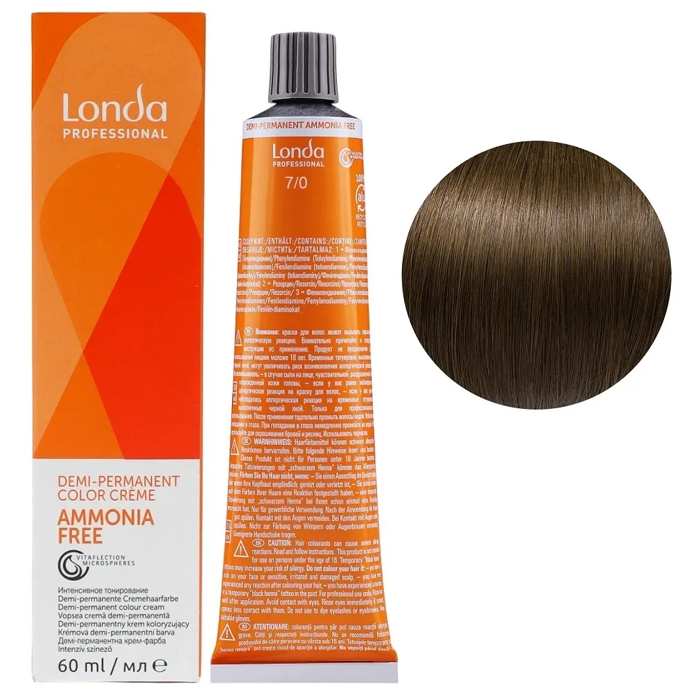 Фарба для інтенсивного тонування без аміаку зі світловідбивними мікросферами Vitaflection створює живе, сяюче волосся з багатовимірним блиском. Demi-Permanent використовує середовище для підлужнення без аміаку та пероксиди низької концентрації, тому прекурсори барвників проникають у волокна волосся менш глибоко. Завдяки цьому структура волосся змінюється менше, ніж при використанні стійких крем-фарб Permanent Color. Особливості продукту: 7/0 середній блондин Демі-перманентна фарба без аміаку, 60 мл Demi-Permanent Color Londa Professional Застосування: 7/0 середній блондин Демі-перманентна фарба без аміаку, 60 мл Demi-Permanent Color Londa Professional Змішати Demi-Permanent Color з емульсією для інтенсивного тонування Demi-Permanent Emulsion Londacolor 1,9% або 4%, в пропорції 1:2. Час витримки залежить від бажаного результату. Важливо! Продукт для професійного застосування. Уважно ознайомтесь з інструкцією.Демі-перманентна фарба без аміаку Demi-Permanent Color Londa Professional
