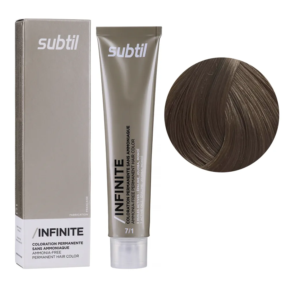 Subtil Infinite - фарба без вмісту аміаку нового покоління, що містить щонайменше 78% інгредієнтів природного походження та трилогію дорогоцінних олій: жожоба, моної, кукурудзяної. Забезпечує 100% зафарбовування сивини, супер блиск та супер стійкість. Безаміачна фарба додає волоссю стійкий і насичений колір, при цьому не ушкоджує і не висушує його. Олії, що входять до складу зволожують і ущільнюють волосся, роблять його блискучим і шовковистим. Щадна формула підходить навіть власницям чутливої шкіри голови. Так само фарба здатна освітлити волосся до трьох рівнів, що є революцією в світі безаміачних фарб. Розкішний колір, гладкість і здоровий блиск без шкоди для волосся. Застосування: 7/1 блондин попелястий Безаміачна стійка крем-фарба для волосся, 60 мл Permanent Hair Color INFINITE SUBTIL Крем-фарбу потрібно наносити на брудне сухе волосся. Фарбу слід змивати ретельно до повної прозорості води. Час витримки: 7/1 блондин попелястий Безаміачна стійка крем-фарба для волосся, 60 мл Permanent Hair Color INFINITE SUBTIL Витримати на волоссі від 30 до 35 хвилин, при наявності сивого волосся час впливу можна збільшити на 10 хвилин. Застосовувати фарбу слід, суворо дотримуючись інструкції, яка додається до кожної упаковки.Безаміачна стійка крем-фарба для волосся Permanent Hair Color INFINITE SUBTIL